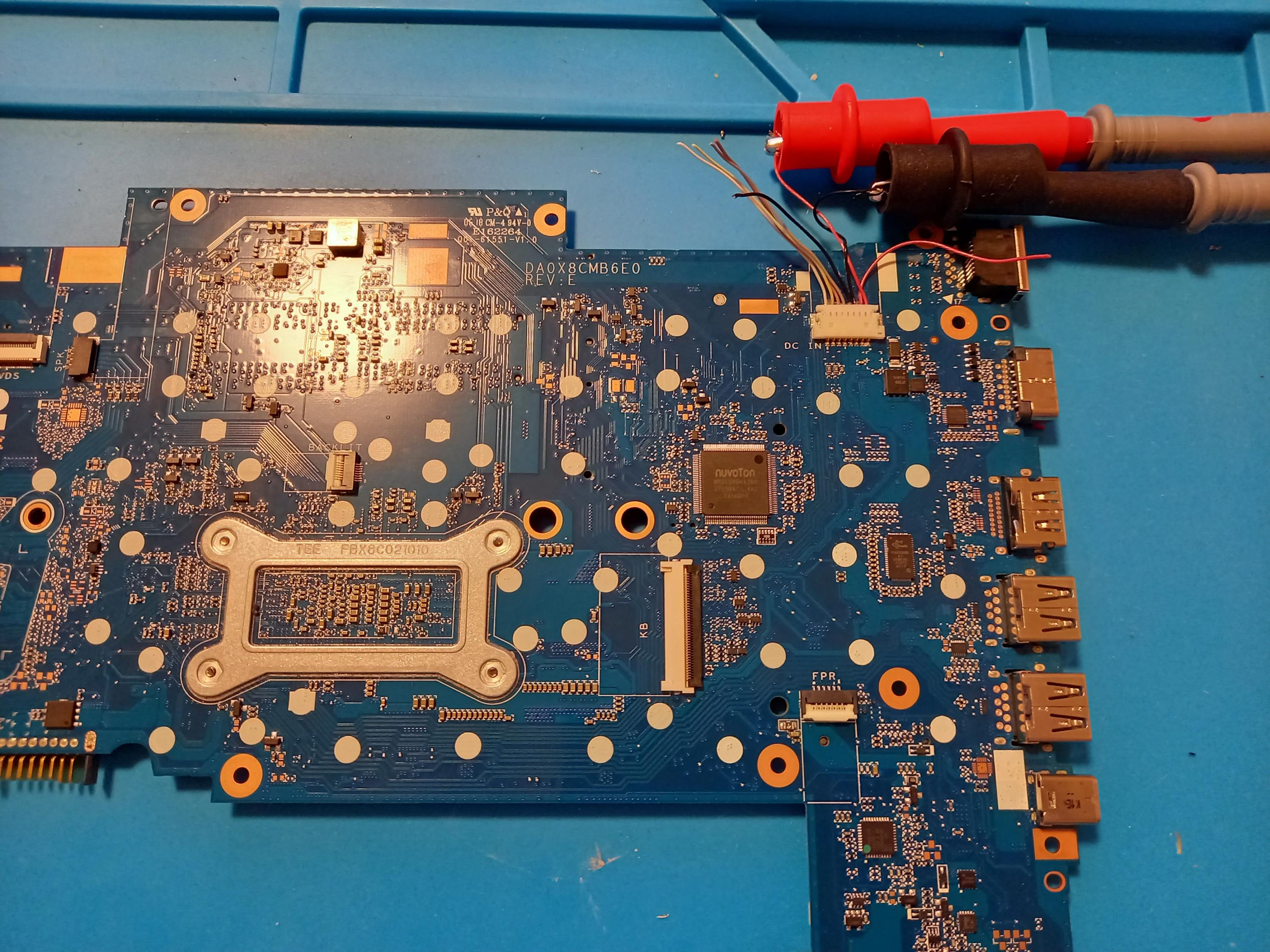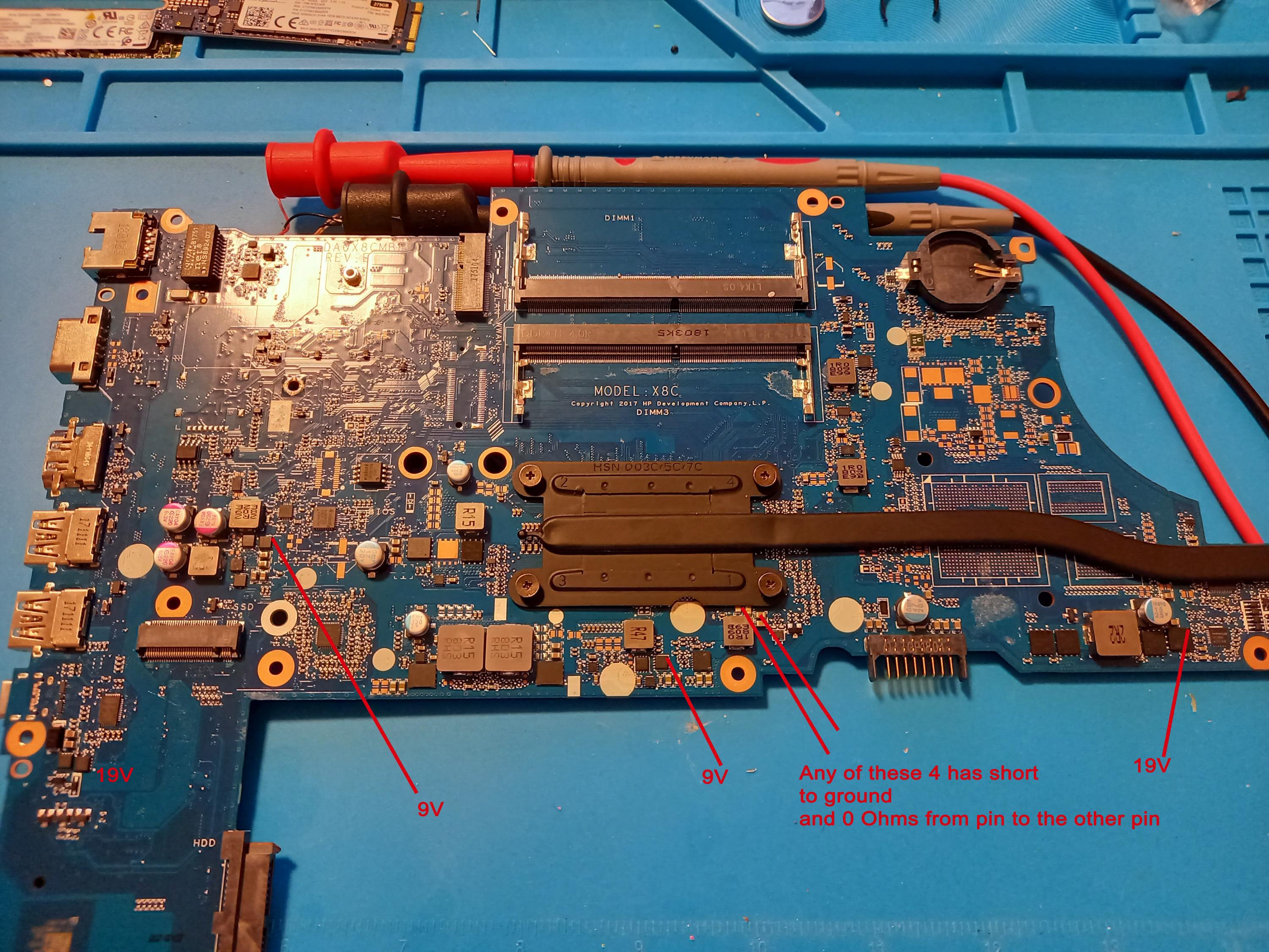 The mainboard switches itself on again as soon as the power is switched on. The power button LED lights up. The CPU gets warm / hot. But there is a short circuit on the board, almost every PIN is connected to ground. If a laboratory power supply is used with a few volts (2-8V), approx. 1A current is always drawn and the mainboard whistles. Since the CPU is always hot, I thought that this vl has a short circuit, how can I measure it?