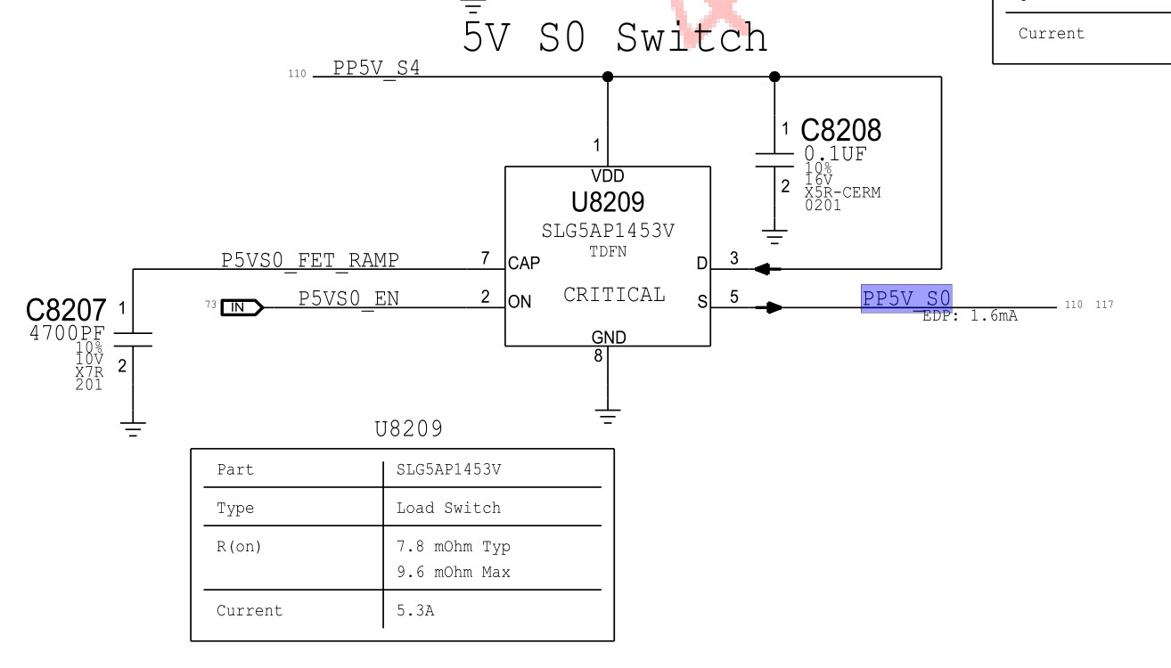 U8209 Pin 1 is pp5v_s4 @ 4 ohms. Other 5V: pp5V_S0 @ 3 ohms, PP5vs5 is good