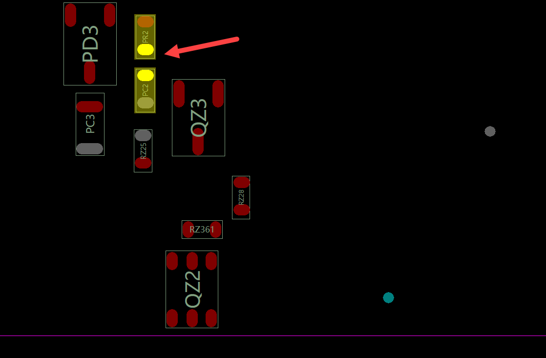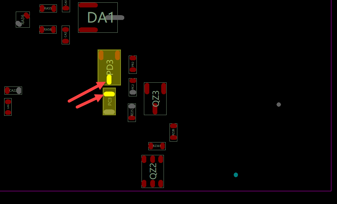 Locate the PC3 cap that will be mated to the common cathode of the dual diode @ PD3.
