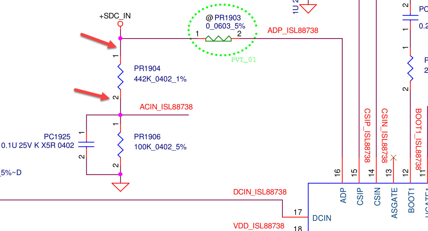 This detect logic is based on a resistor based voltage divider. The resistors are PR1904 & PR1906. Each must be a resistance value close to the values in the schematic. Together, they will take the rather high (~20VDC) input voltage from the AC adapter and lower it to a safe value that the charger IC (PU1900) can handle. From the attached and crude board view file in my database, we do not know which side of the resistor is which so: