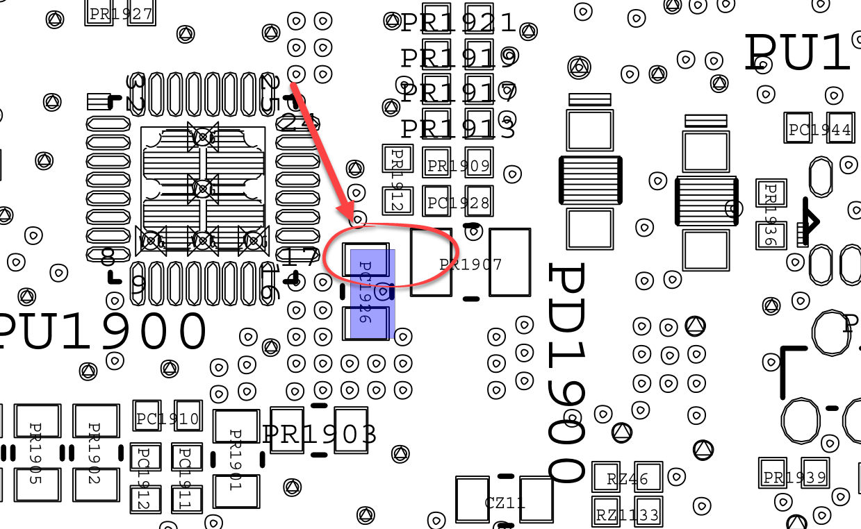 That is, PC1926 - pin # 2 indeed does connect to resistor PR1907, pin # 1 before this common junction connects to PU1900, pin # 17. So this all looks good at this time.