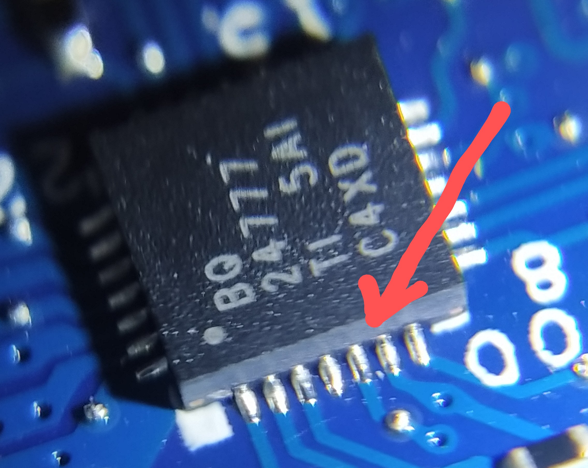 I found near pin 4 of PQ200 something like side-melted housing. I found that there is a short between pin 4 and 5 of this chip.