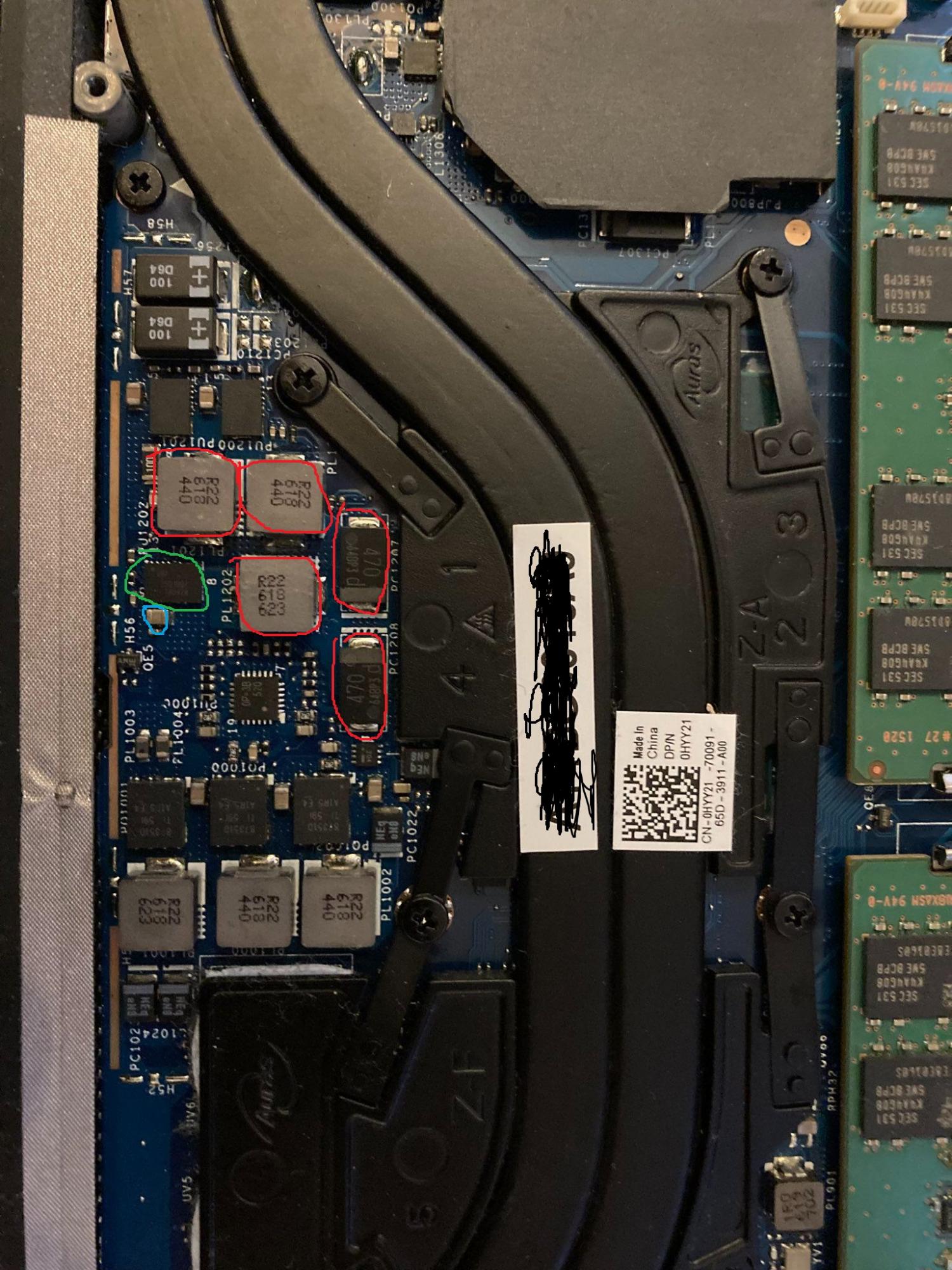 I included a photo of the motherboard which I did some probing on, finding that the encircled caps/diodes are shorted (red). I also encircled an IC on the board (green) which I think is the Alpha Omega Z5019QI, of which one side is not shorted (blue) so it might have to do something with this IC?