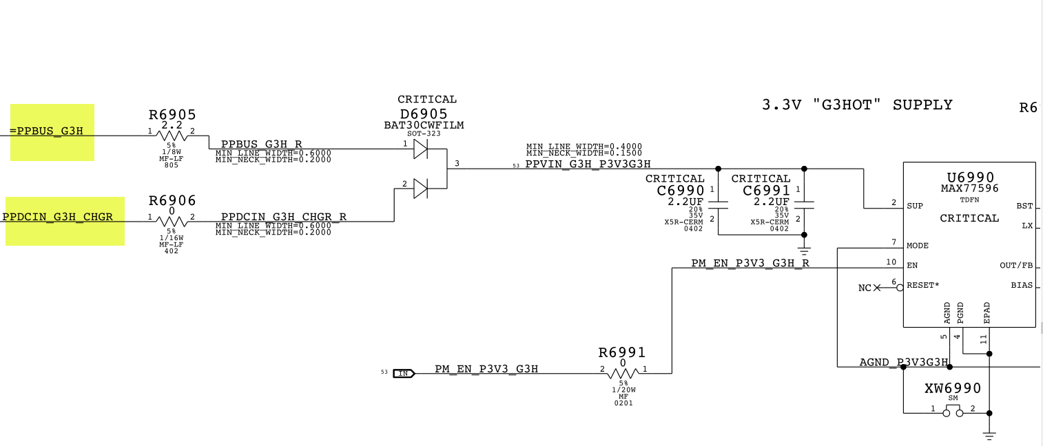This is because F7000 is removed. The dual diode @ D6905 takes the input from F7000, pad # 2 (right side in the schematic), to power the LDO regulator which creates the 3v42 rail = PP3V3_G3H.