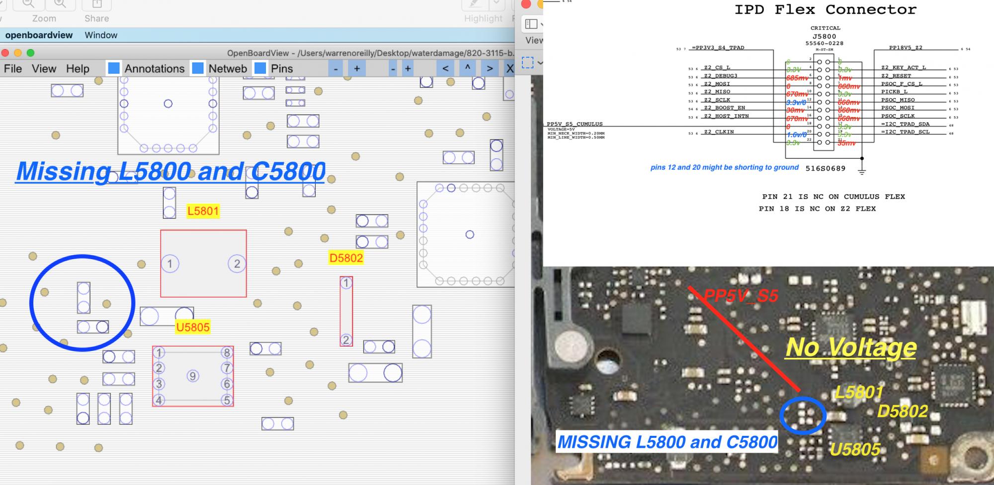 Im actually surprised it was just one wire, as I thought a few of the voltages on flex connector J5800 were a bit erratic.