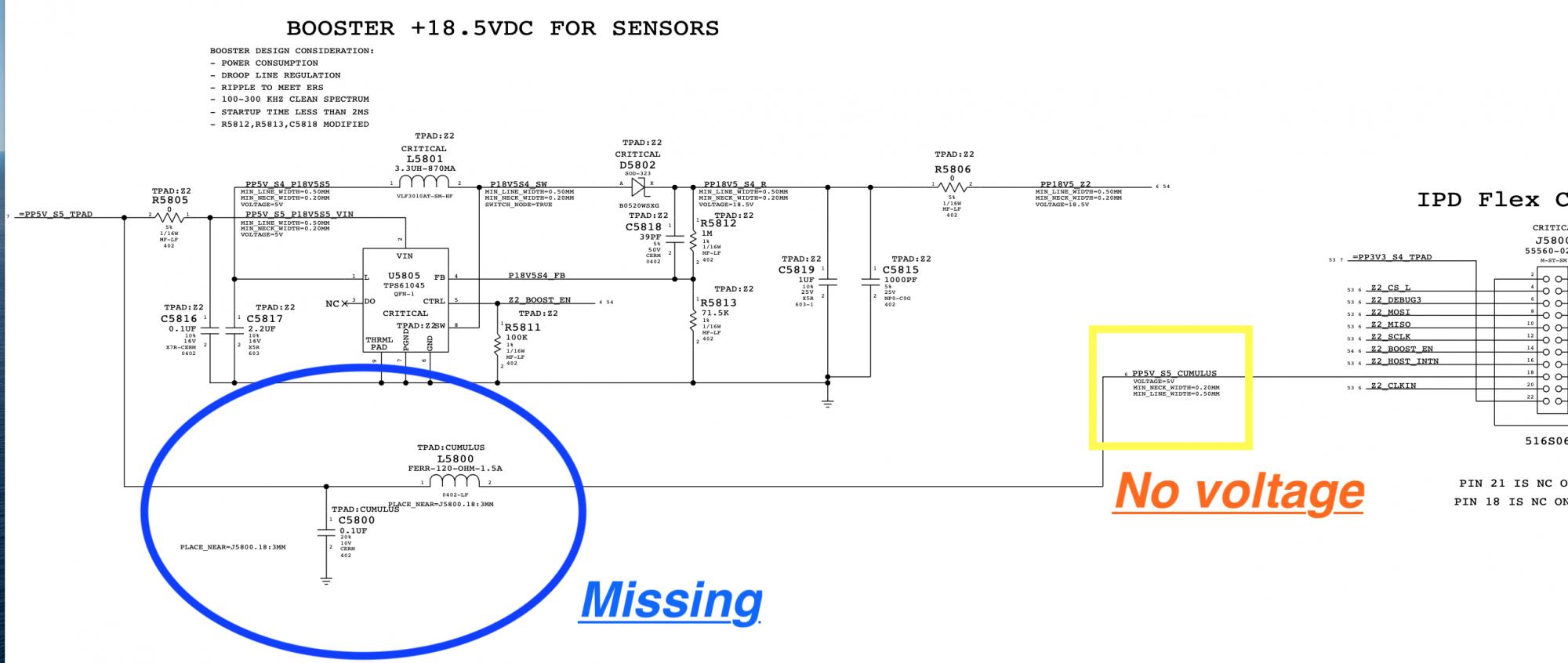Once you have that sorted, PP18V5_Z2 will require an enable (high) to pin 5 of U5805. This enable appears to come from the trackpad itself, so would rely on PP3V3_S4_TPAD being present on J5800 and a functional trackpad.