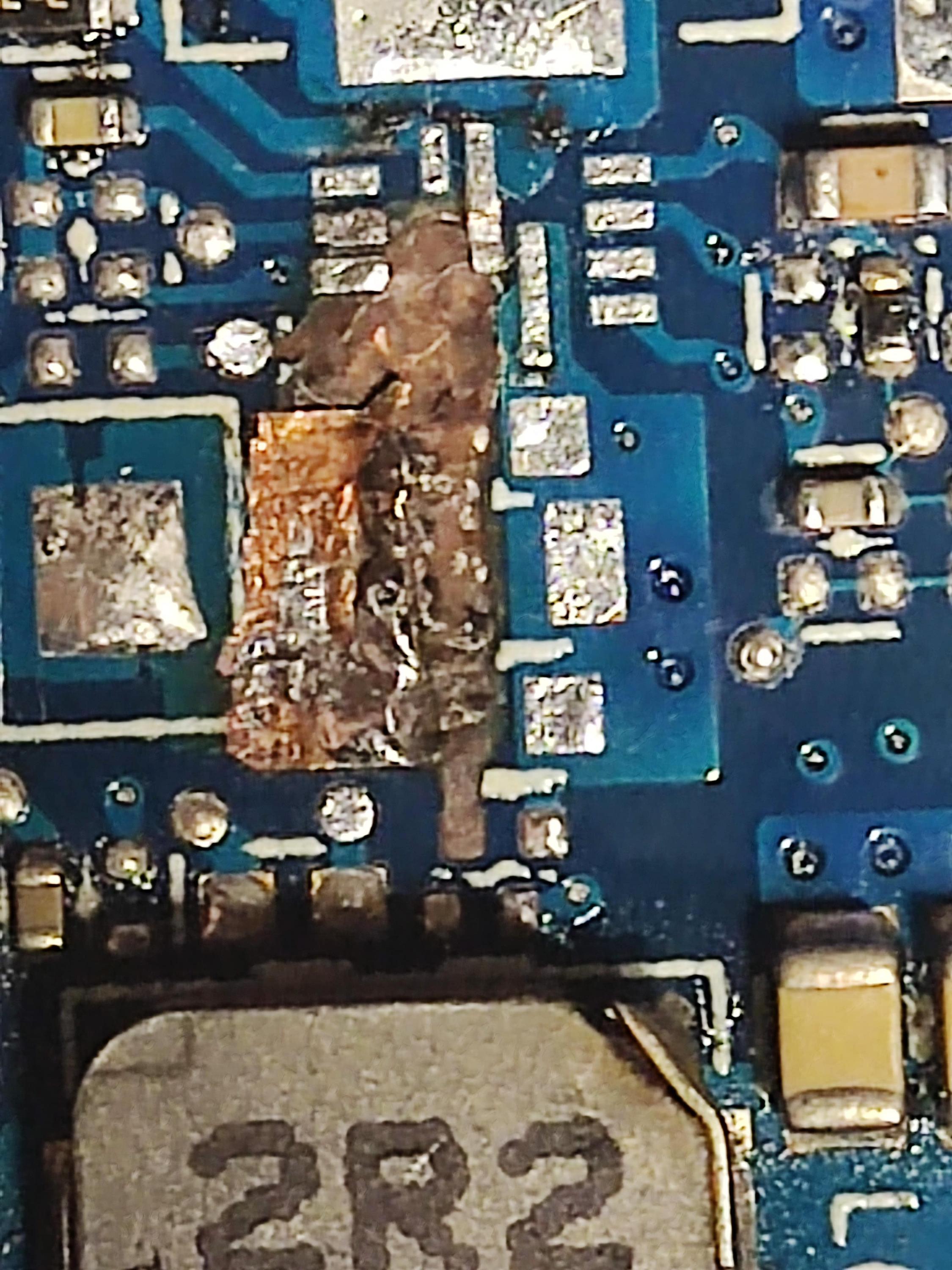 I'm here to ask your help about a laptop repair, 6050a2725001-mb-a01. From what I could see, there was liquid damage. As you can see from the pictures, there is a whole power line burned because of a short in liquid.