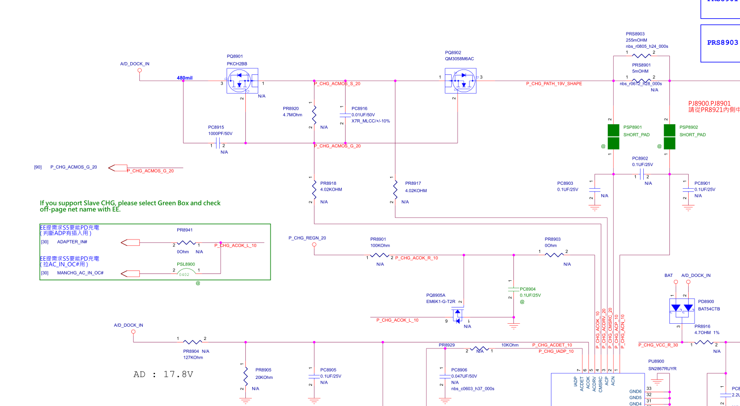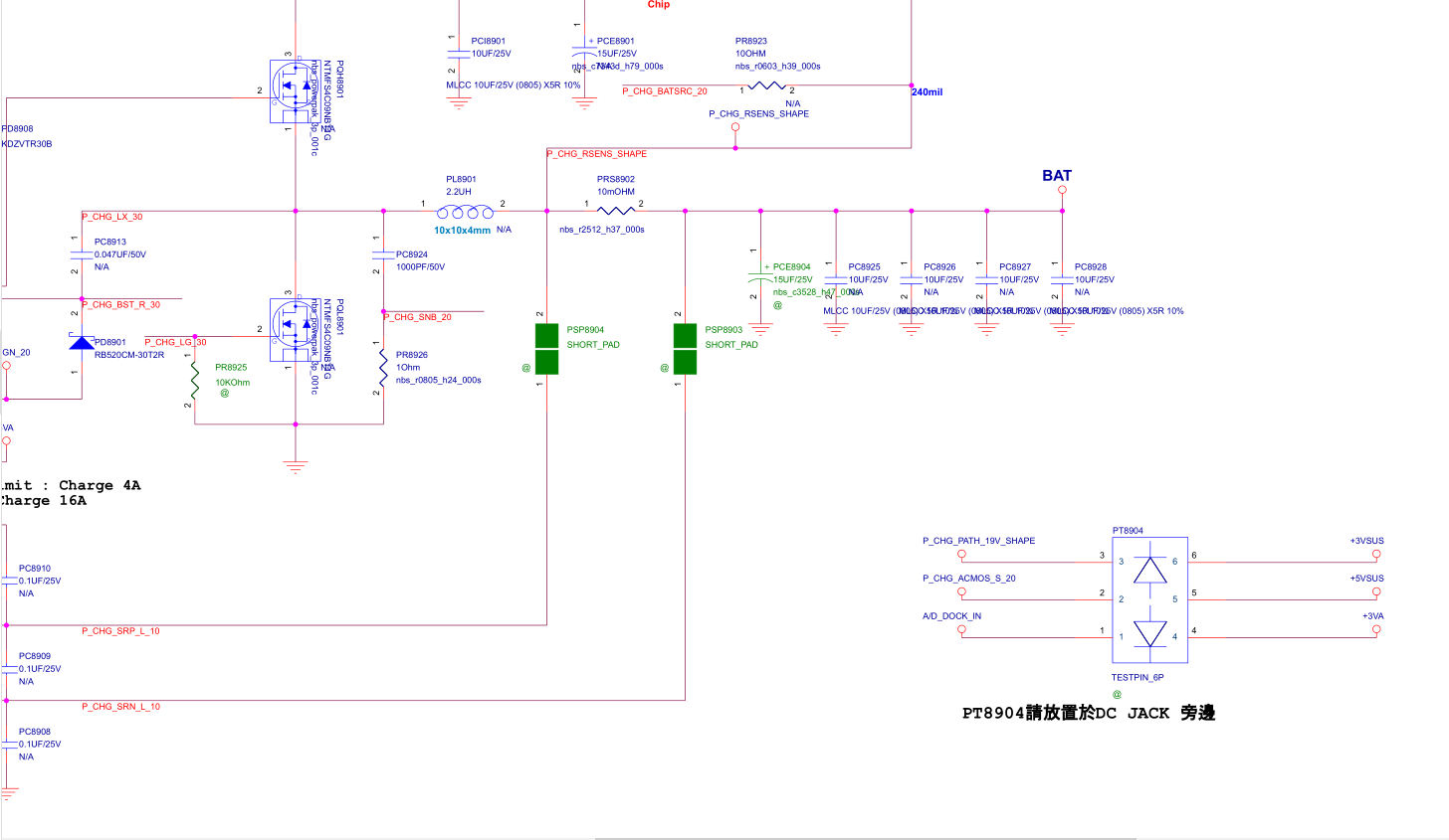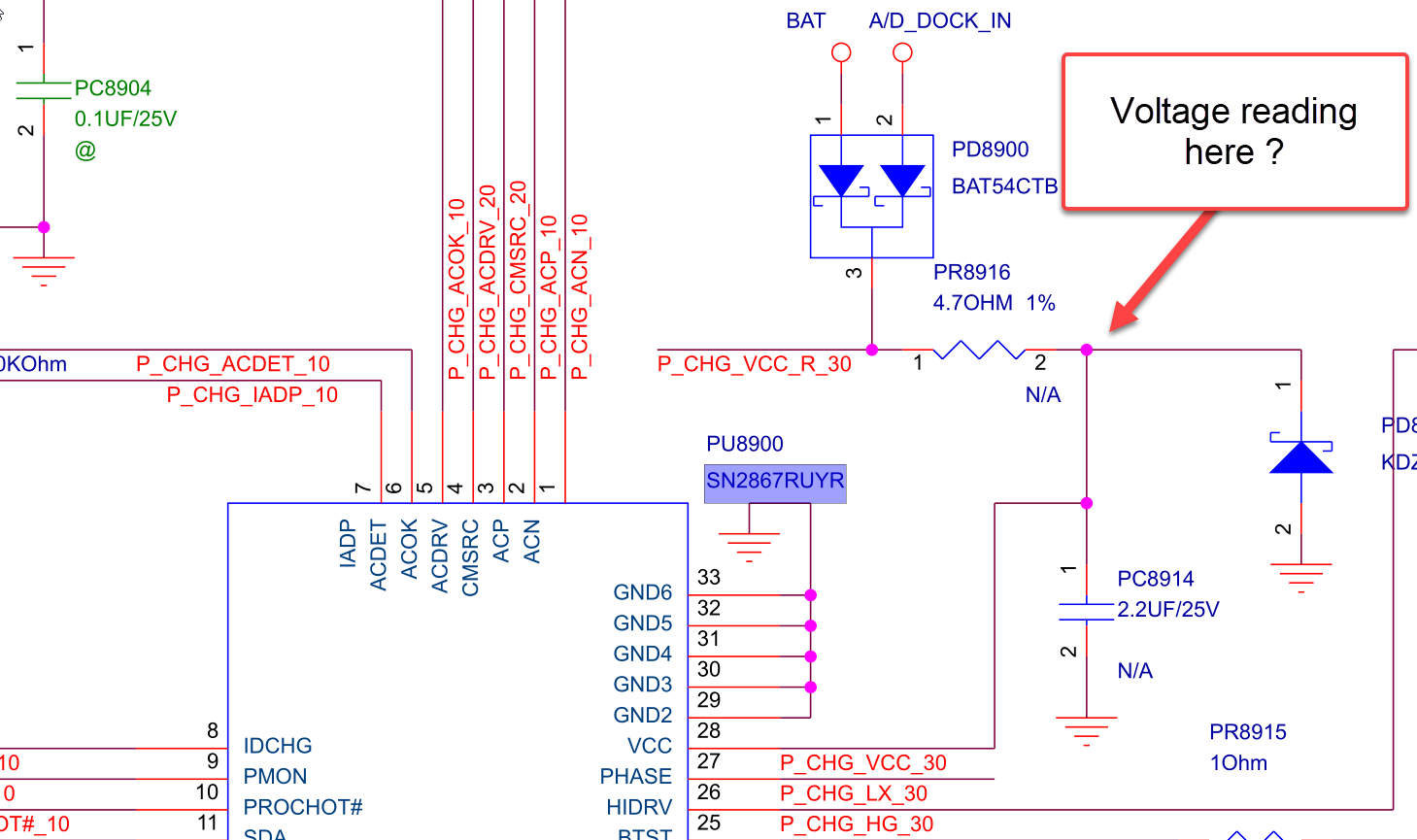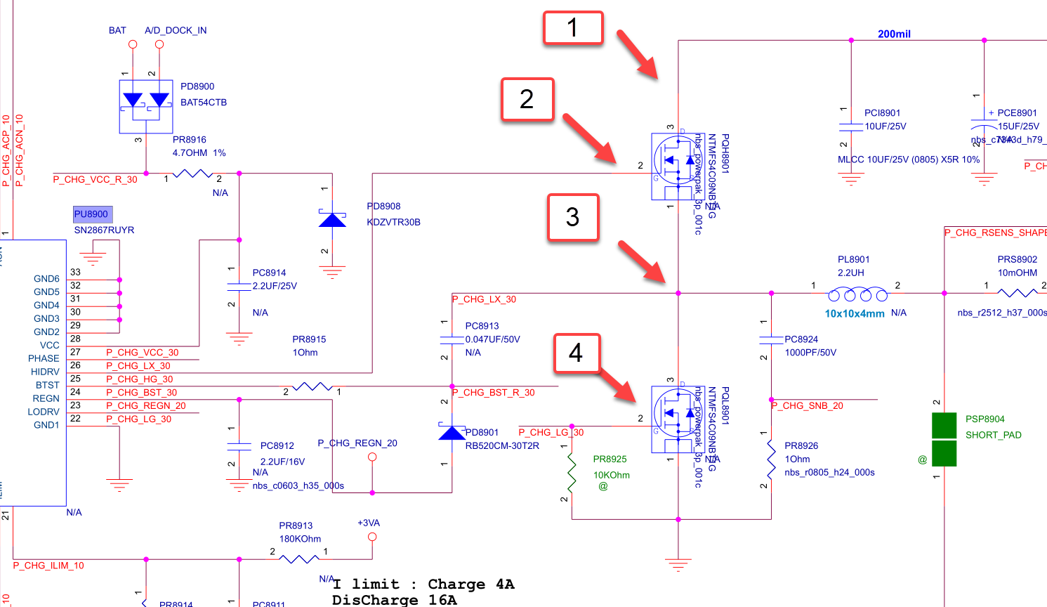 Post the voltage readings for each point of interest on the battery charge mosfets.