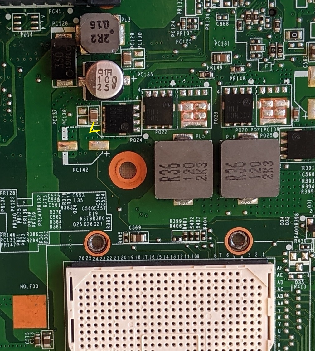 Sooo, the bad capacitor (PC42) is connected with that near cap PC35 (and probably others) and, in the opposite side, with PC138 cap and the first CPU mosfet PQ24.