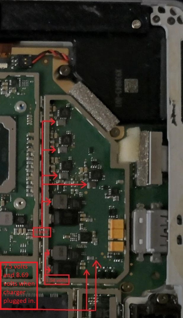 This varying voltage between 7.5 volts and 8.69 volts seems very strange for me and 1.54 volts on inductor near usb port instead of 3.3 volts is obviously an problem. Fact I have no 5 volts on inductor lying between usb port and display port connectors is also an problem.