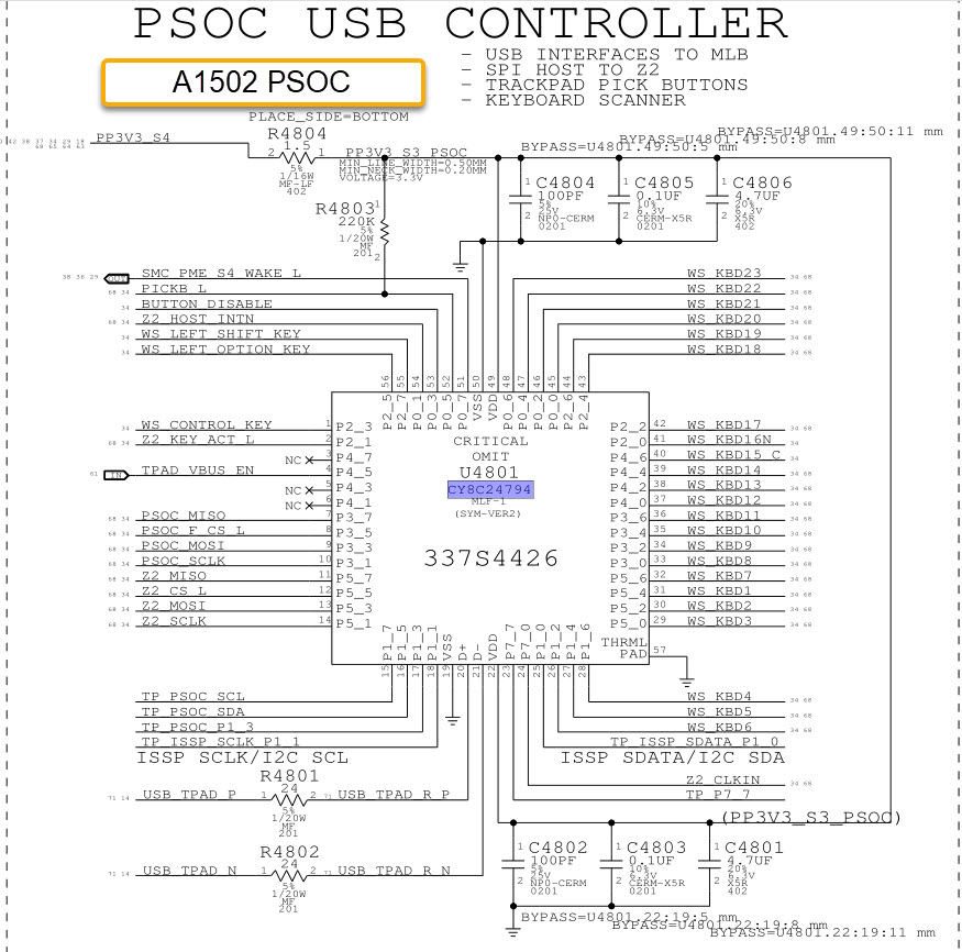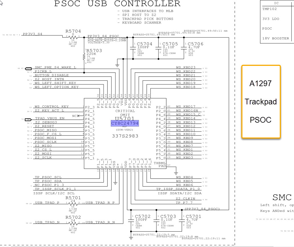 Here I have macbook a1502 with (13" macbook pro) working keyboard but not working trackpad... no water damage all is clean, track and pads are ok so i think problem is with CY8C24794 usb chip.. my question is , will a1297 DONOR BOARD WITH SAME CHIP be compatible if i use the CY8C24794 from the a1297 (17" i7 macbook pro)...