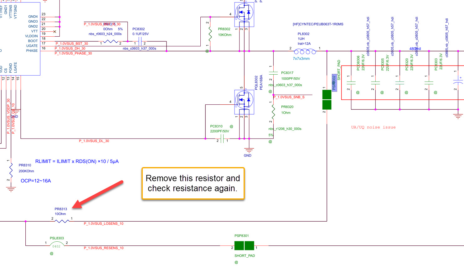 Still have this low resistance ? Then review the trace with PSP8302 -> leads to a resistor @ PR8313. Is this correct ?