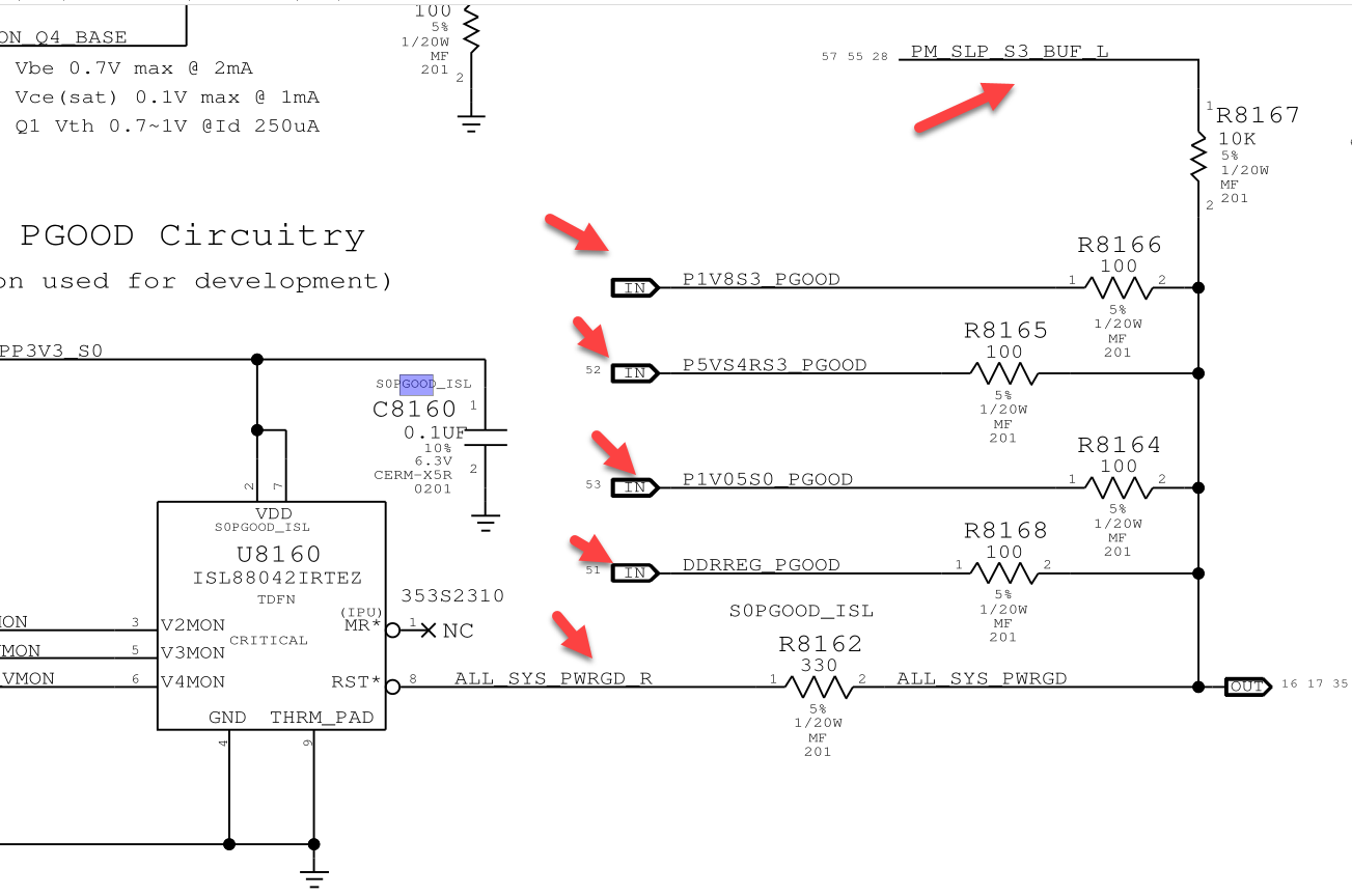 P3V3_S5 3.27 P3V3S5_EN 3.35 P5VP3V3_VREG3 3.23 PPDCIN_G3H 14.80 PPBUS_G3H 116 8.39 "shouldn't this be around 8,60v"? PP3V42_G3H 277 3.36 PPRTC_G3H 414 3.26 PP5V_S5 430 4.94 PP5V_S4RS3 399 jumps 1 time PP3V3_S4 468 0.00 jumps 1 time PM_SLP_S4_L jumps 1 time - 460 *** RTC_RST_L 3.26 PM_DSW_PWRGD 3.35 SMC_RESET_L 486 3.32 PLT_RESET_L 509 0.00 SMC_ONOFF_L 675 3.34 SMC_BC_ACOK 470 3.23 SMC_PM_G2_EN 519 3.36 S5_PWRGD 564 3.32 PM_PCH_SYS_PWROK 742 0.00 SMC_ADAPTER_EN 548 3.35 PM_SYSRST_L 706 jumps 1 time *** 0.01 PM_PCH_PWROK 950 jumps 1 time *** 0.00 PCH_DSWVRMEN 792 3.16 PM_DSW_PWRGD 746 3.35 PCH_INTVRMEN_L 3.16 PM_PWRBTN_L 527 3.35 (->0.35 when SMC_ONOFF_L to 0) PM_BATLOW_L 531 3.26 PP3V3_S5_AVREF_SMC 590 3.22 PM_RSMRST_L 627 3.23 PP1V2_S5_SMC_VDDC 482 1.18 PP3V3_S5_SMC_VDDA 280 3.35 ALL_SYSTEM_PWRGD 416 jumps 1 time 0.00 U1950 1 ALL_SYSTEM_PWRGD 402 pulse 2 CPUVR_PGOOD_R 735 pulse 3 SYS_PWROK_R 694 NO pulse 4 GND 5 PM_S0_PGOOD 675 pulse 6 SMC_DELAYED_PWRGD 722 pulse 7 PM_S0_PGOOD 675 pulse 8 PP3V42G3H 280 3.36 U1900 1 PPVRTC_G3H 433 3.26 2 PP3V3_S5 335 3.27 3 SYSCLK_CLK25M_X2_R 434 0.00 4 SYSCLK_CLK25M_X1 430 ~0.54 5 PP3V3_S5RS3RS0_SYSCLKGEN 327 3.27 6 PP1V2_CAM_XTALPCIEVDD 315 0.00 7 GND 8 SYSCLK_CLK25M_CAMERA 438 0.00 9 NC 438 0.00 10 GND 11 GND 12 PCH_CLK32K_RTCX1 442 ~0.39 13 PP3V42_G3H 285 3.36 14 PP3V3_TBLC 390 0.24 15 SYSCLK_CLK25M_TBT 426 0.00 16 GND