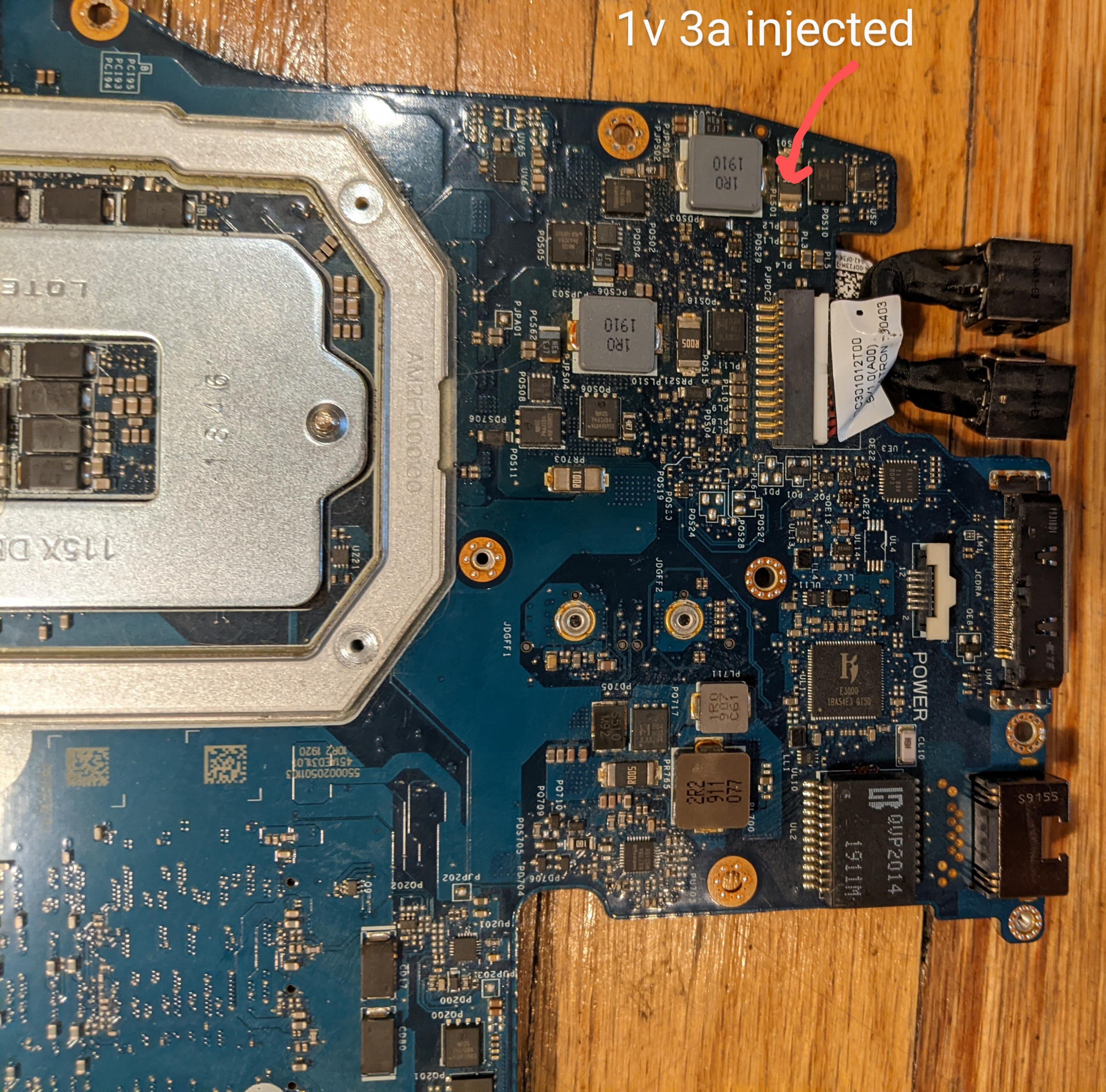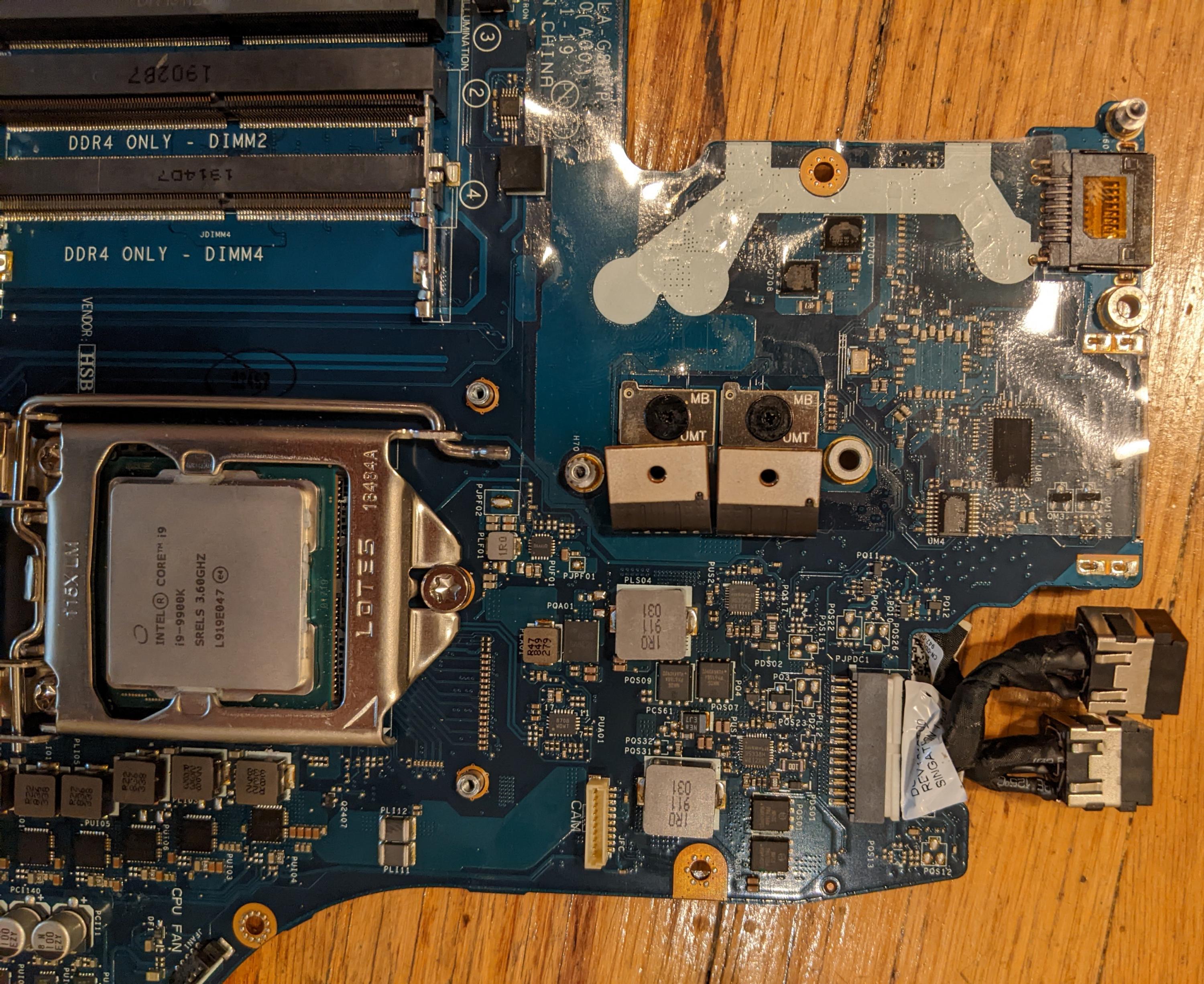 Alienware Area 51M laptop. This monster has an i9-9900K desktop CPU and replaceable GPU. For full performance it requires two power adapters. The system works, but complains of insufficient power when posting with only 240W adapter connected. Unfortunately there is a short to ground on one of the power rails so the secondary power adapter cannot be utilized. In testing there is a short across the pins of DC in connector so it seems like it should be an obvious short on a component like tvs diode that has blown to protect board. The shorted jack trace goes through board and on the other side there are a bunch of shorted components where it comes out. But I haven't located the source of the short. Some photos are attached. As usual,
