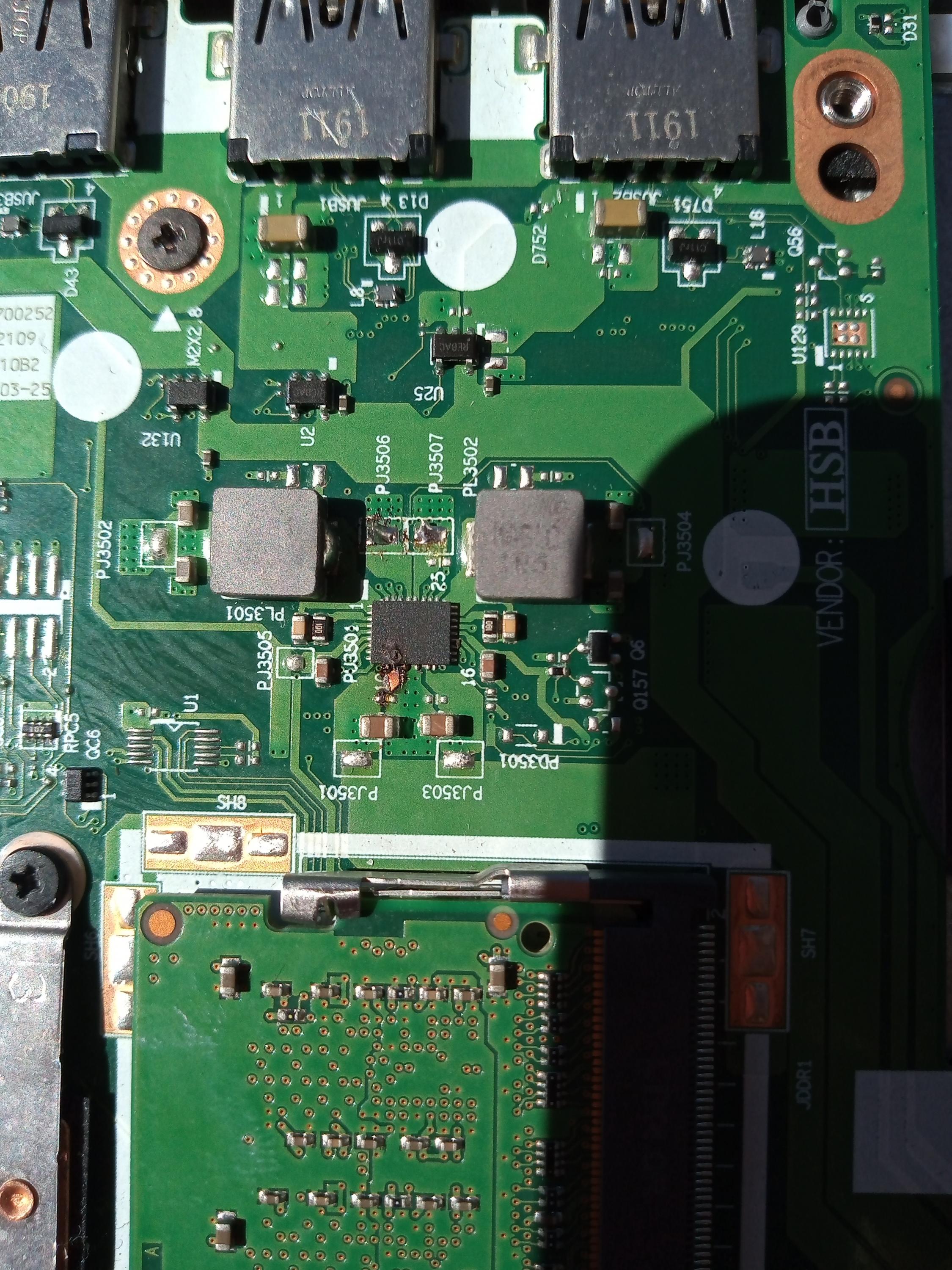 Hello guys! I brought a lenovo ideapad s145-15ast laptop to my workshop with ignition problems, the client told me that he left it charging for more than 48 hours, he proceeded to uncover it to make a diagnosis when I connected it to its power supply smoke began to come out of one of the chip of the motherboard the "PU3501" a complete deterioration of that area is also observed, the components PJ3506 and PJ3507 have also been blown.