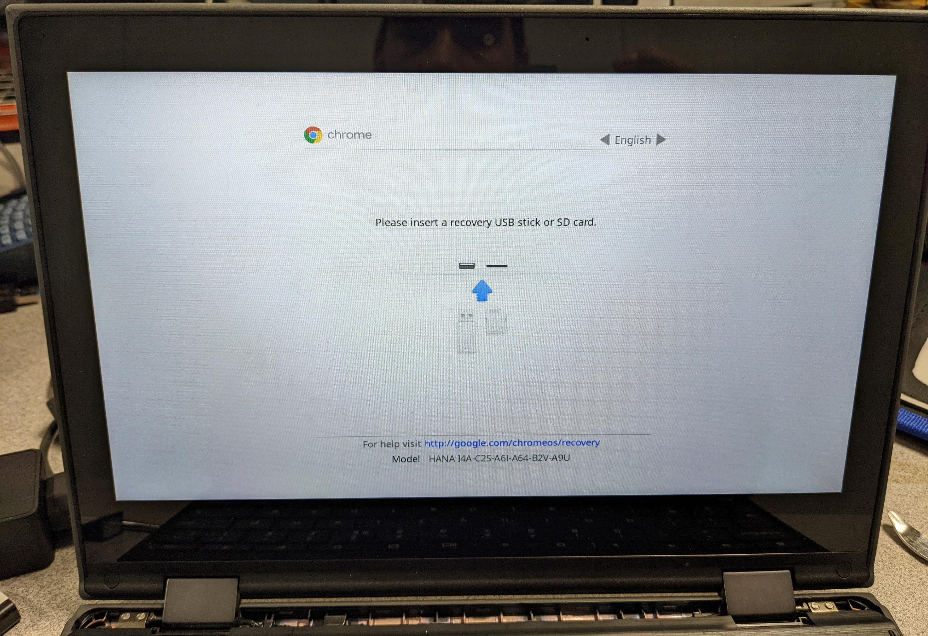 So far I have concluded that ESC + Refresh + Power only works once the internal battery is disconnected, however it does not come up with the classic Google yellow [!], it comes up with "Please insert a recovery USB stick or SD Card (please see attached image)