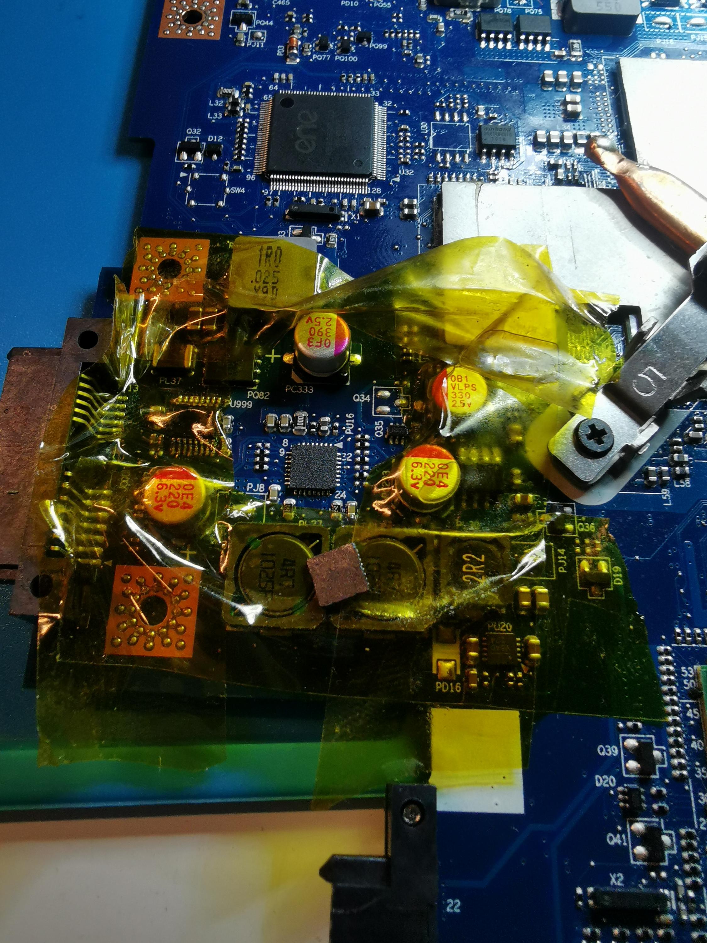 Oh and for info if i plug both the battery and the adapter , i can't power on the laptop this time. Previously before replacing the capacitor i can start with both battery and adapter but remember i have voltage after PQ52 that oscilate between 7 and 9v +-.