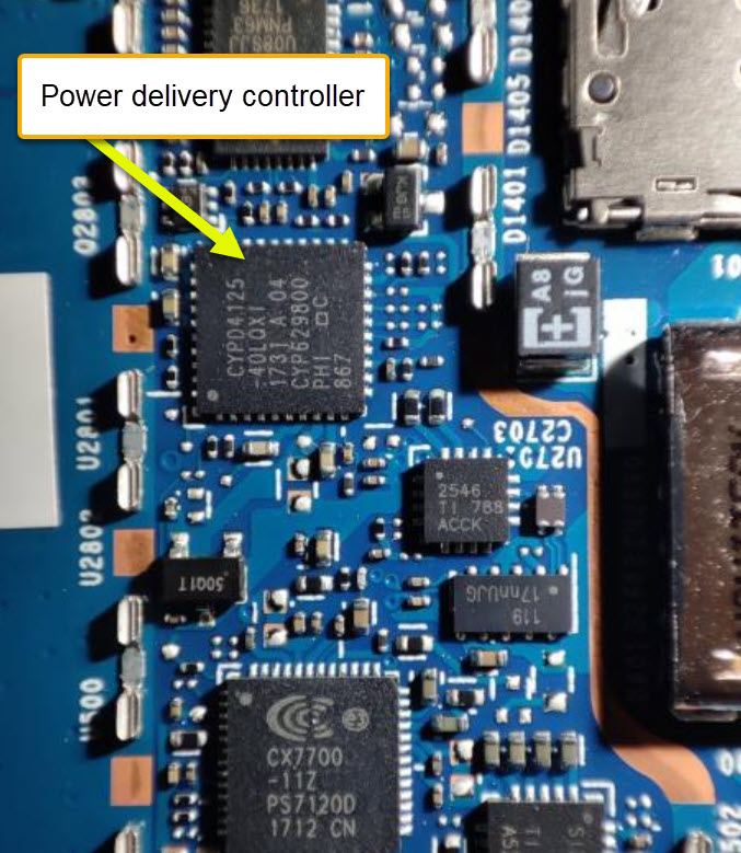 Cypress p/n CYPD4125 is the USB Type C controller for this logic board.