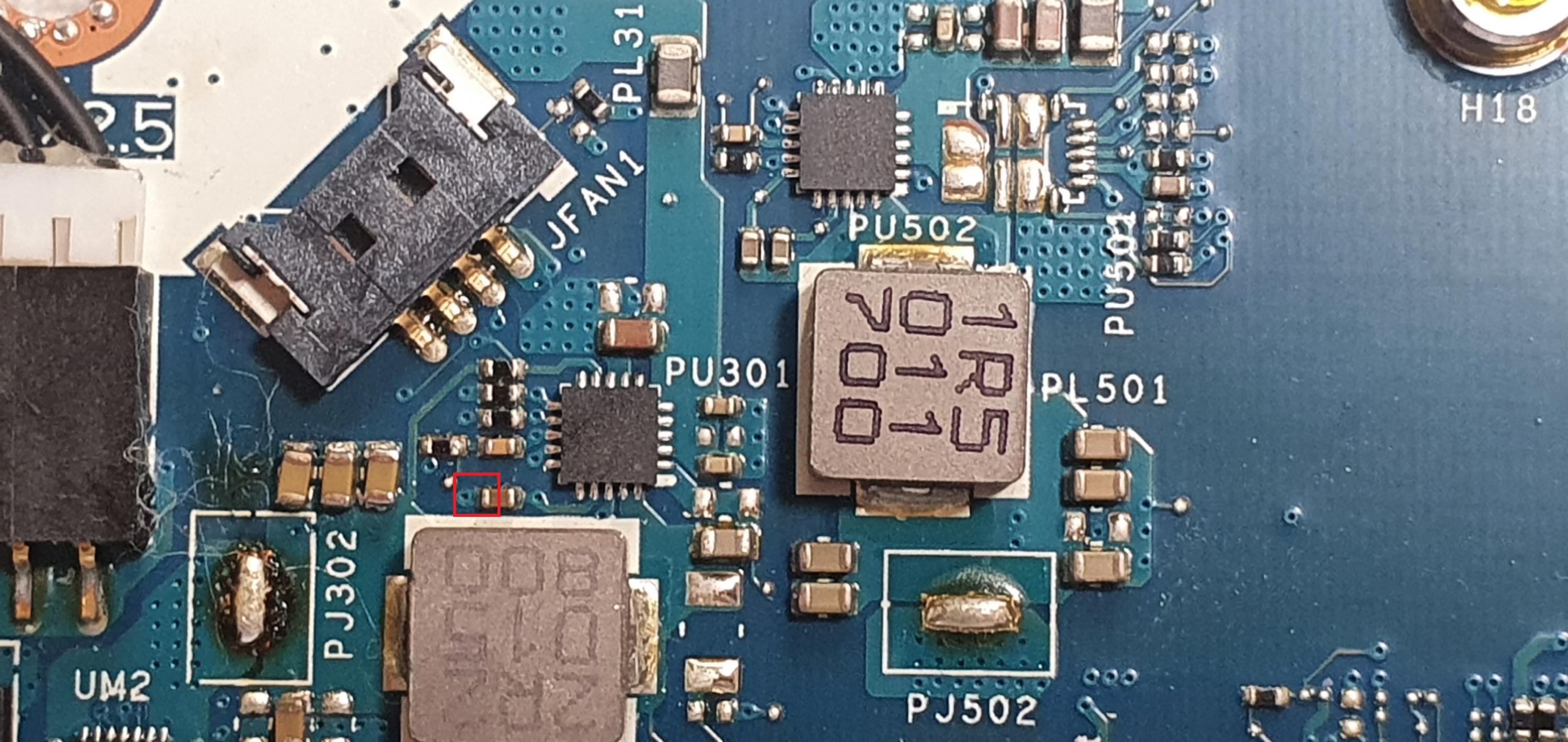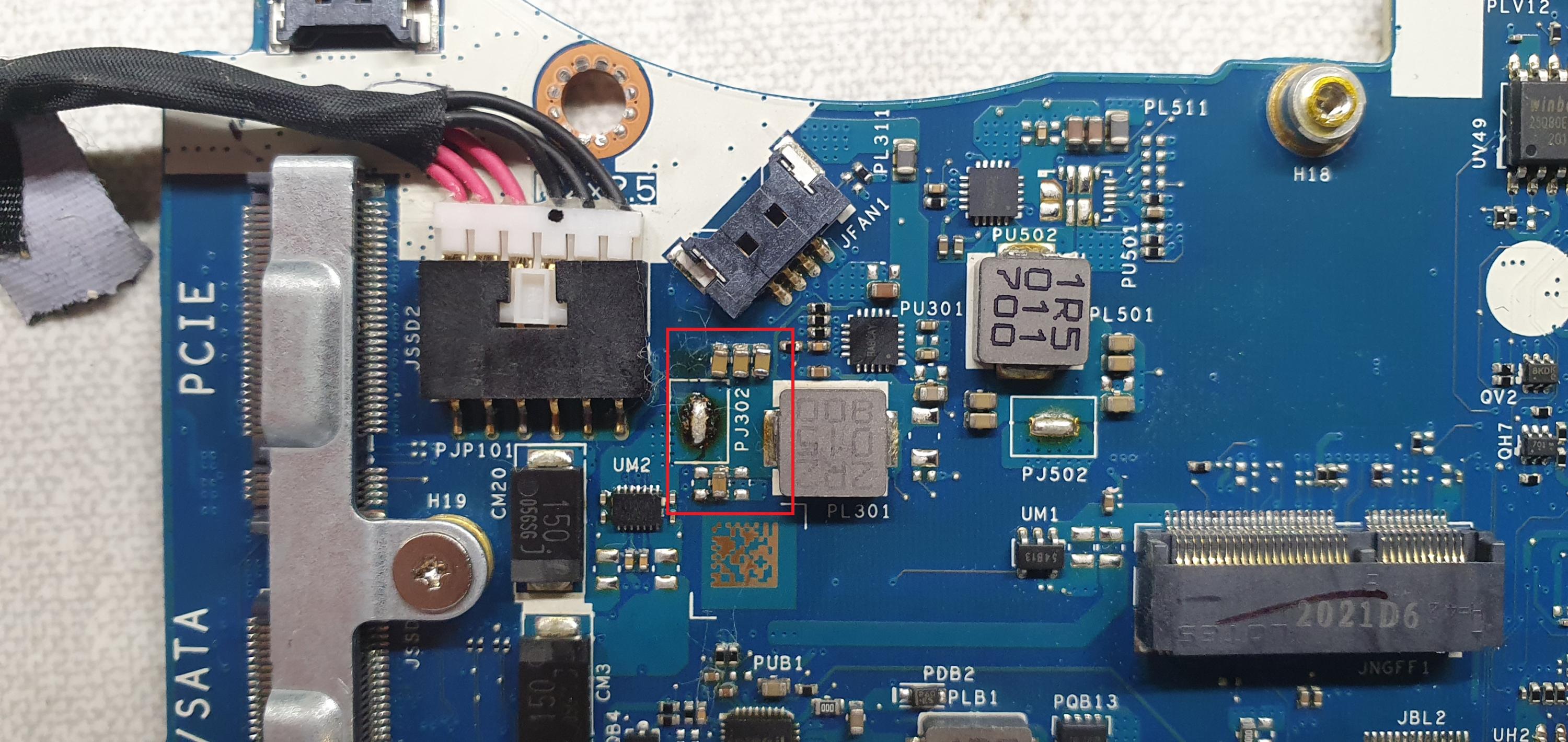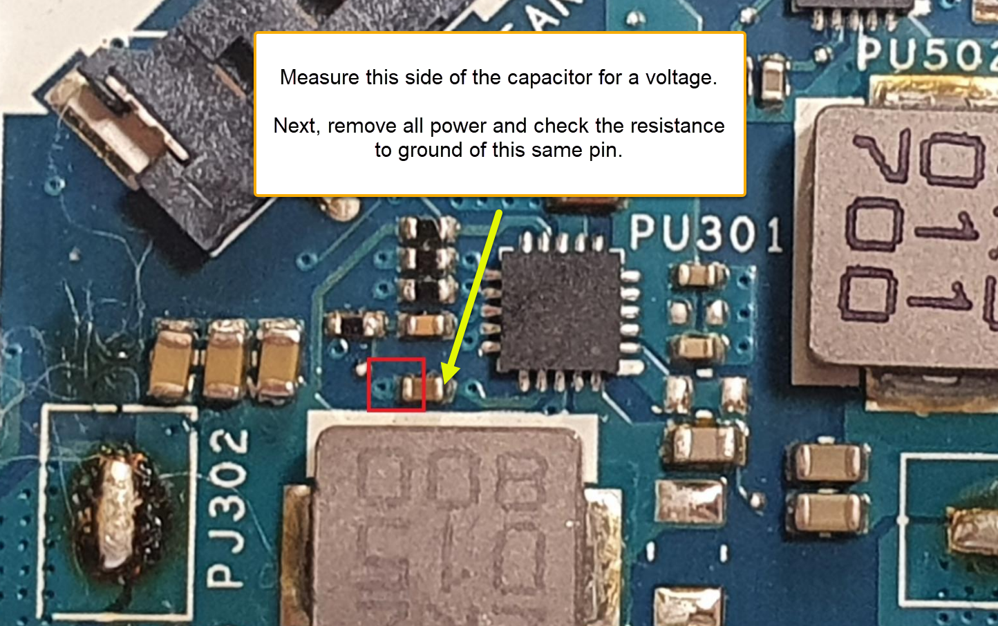See the solder blob inside the white rectangle nearby at PJ302. Remove this solder blob to isolate the main LDO rail producer from the load (consumer side). This PJ302 is acting like a short circuit to pass the voltage downstream.