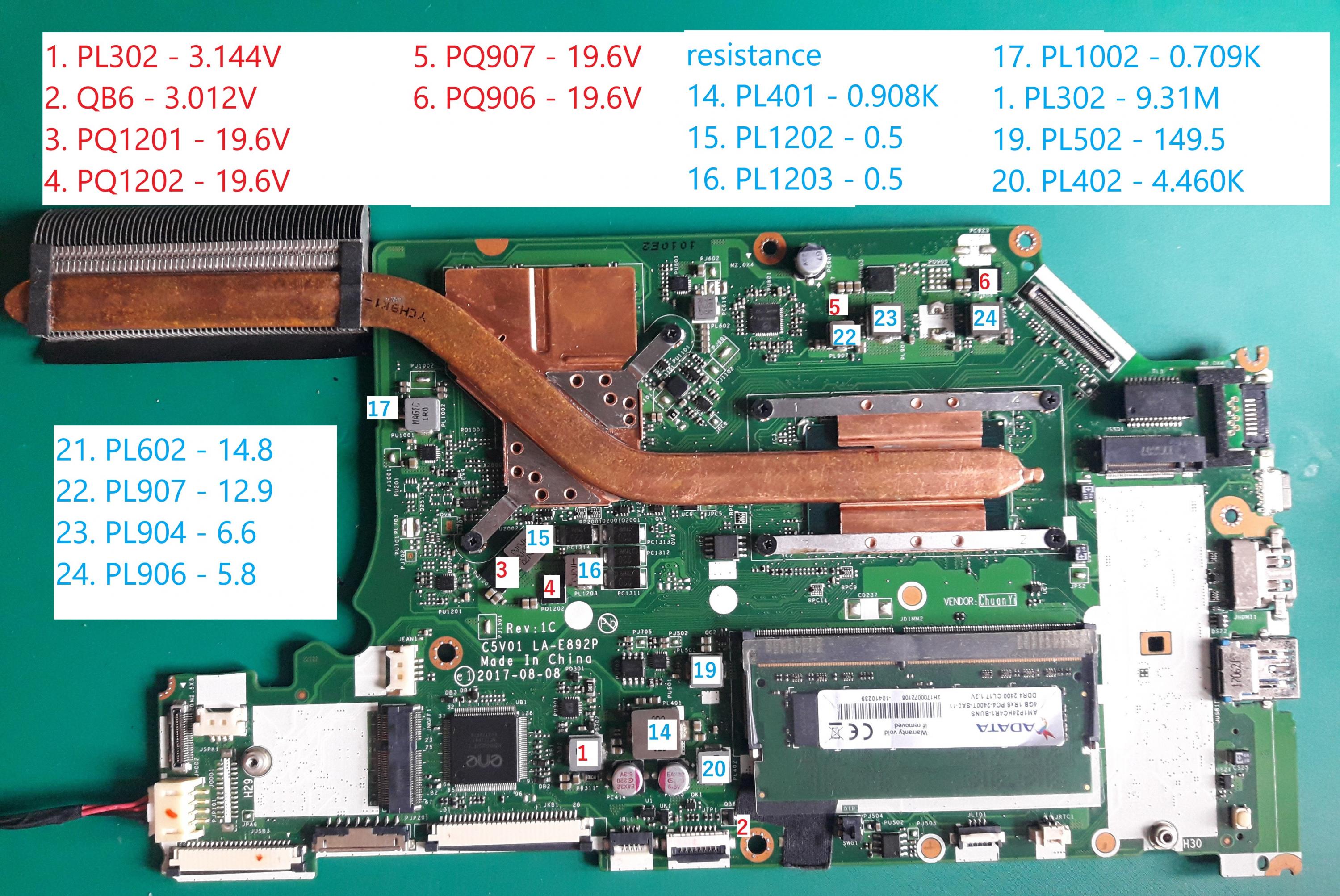 Dear all, I am trying to troubleshoot an Acer Aspire 5 A514-55 that won't power on. I'll describe the symptoms and my findings so far, and I would like to seek guidance and suggestions on possible suspects in terms of cause/component failure. My initial thoughts are battery charger IC and/or ideal diode/MOSFET (that switches between incoming DC and battery power), but I could be totally wrong on this.