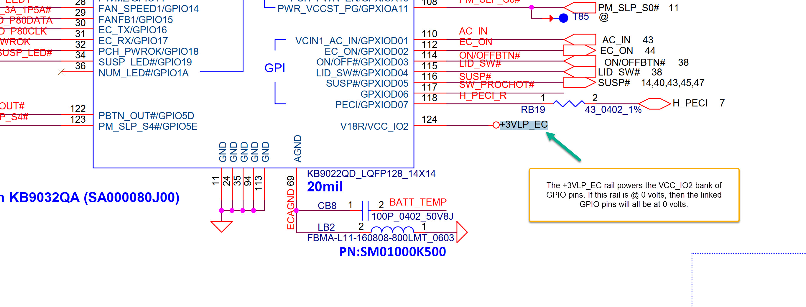 The +3VLP_EC has to receive power to power the GPIO pins on VCC_IO2 bank. If this rail is 0 volts, then the batch of GPIO pins on UB1 will not be powered.