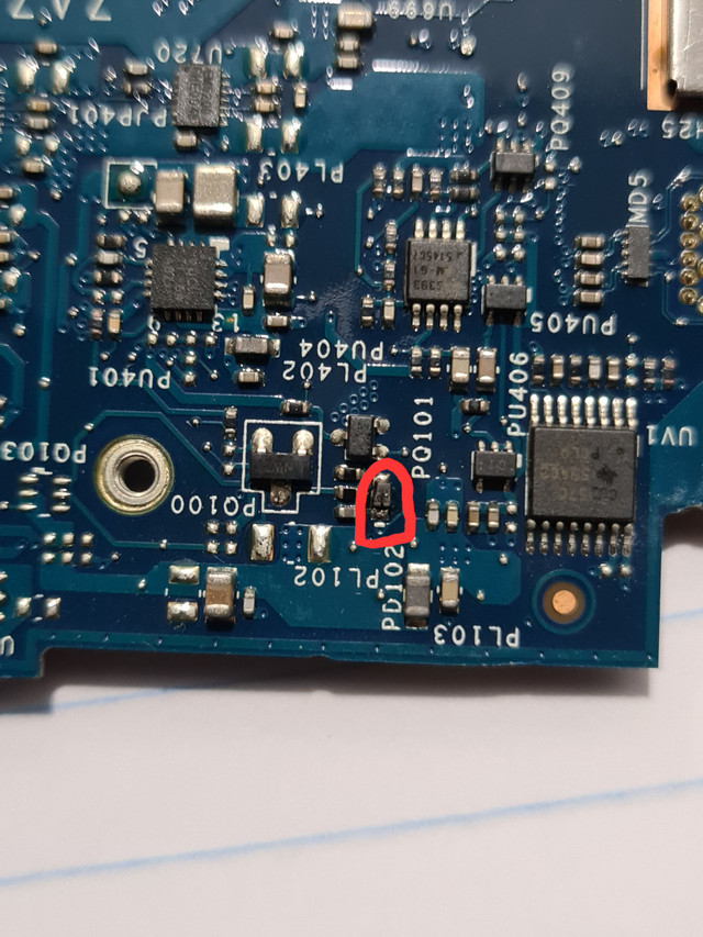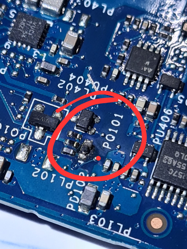 Hi, please I need your help with a serius problem, months ago my Dell XPS stopped charging, I tried all the recommended methods (try original charger, power connector cable, drain battery) but nothing worked. finaly I disassembled the motherboard and discovered that near the "PQ101" there is a burned component, but I cannot identify it to replace it. I leave a couple of photos, maybe you can help me. thaks a lot.