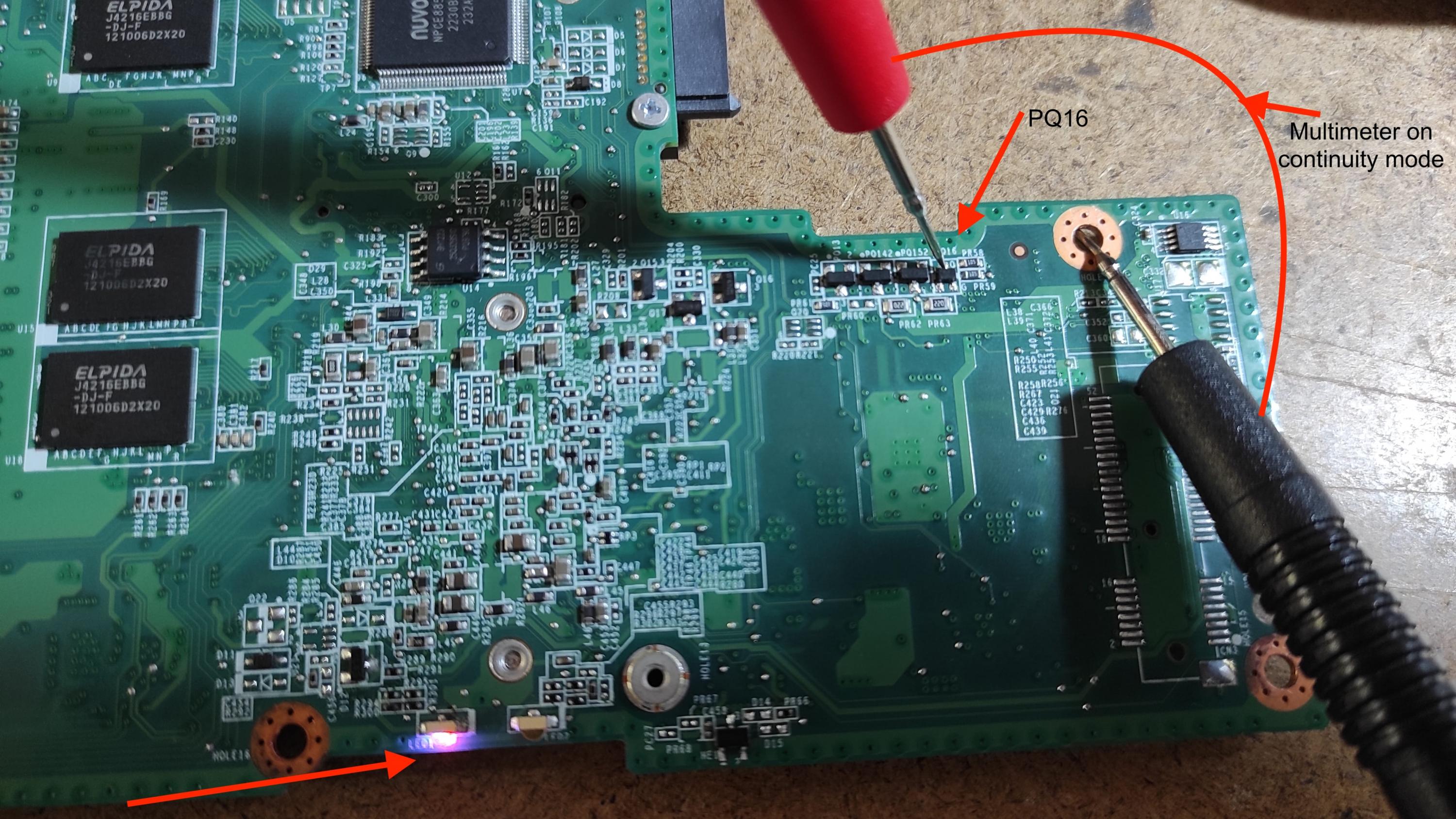 PQ16 pin 0?→ 9.2v and continuity to ground ? When check continuity to ground the motherboard led 1 switches on. Is there a problem on PQ16, can be shorted?