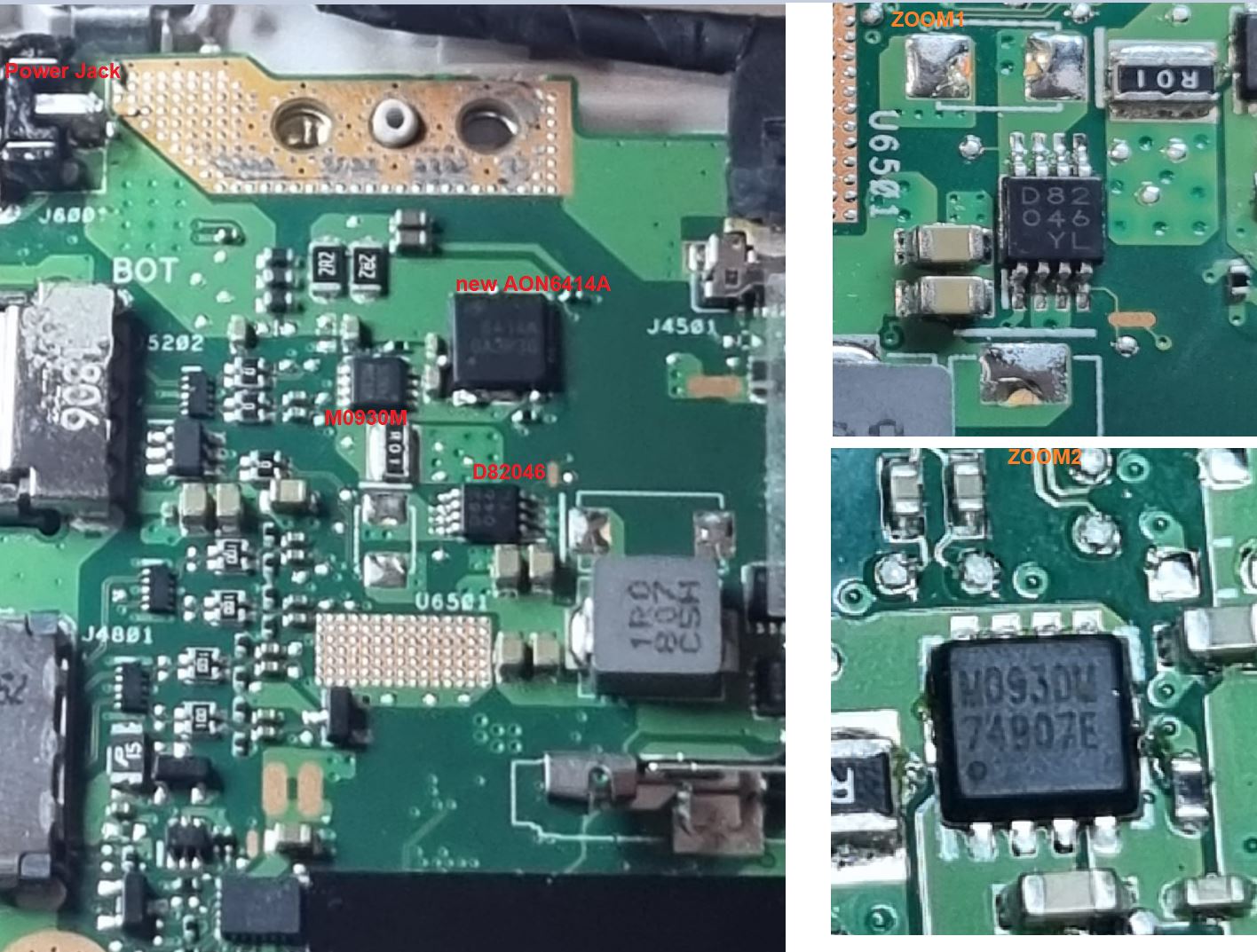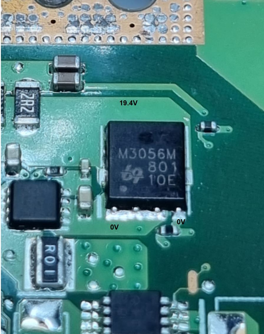 I got this Asus Vivobook with 10% battery left, so it was working on battery (now battery is empty). When pluging power supply it was not charging. Power supply is working, I get 19.4V. When connected I can measure 19V until MOSFET.