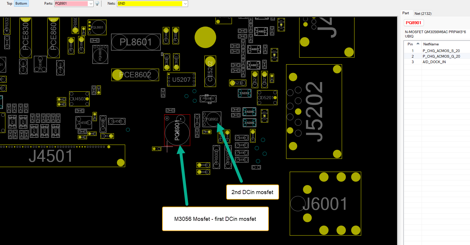 Review the logic board for a square ic that should be near the dcin connector area. Topside markings should be 'BQ' or similar. The same charger IC will drive these mosfets linked to the battery charging circuit. That is, the gate pin #4 of the mosfet will feature a series resistor and the other side of the series resistor will be to the charger IC.