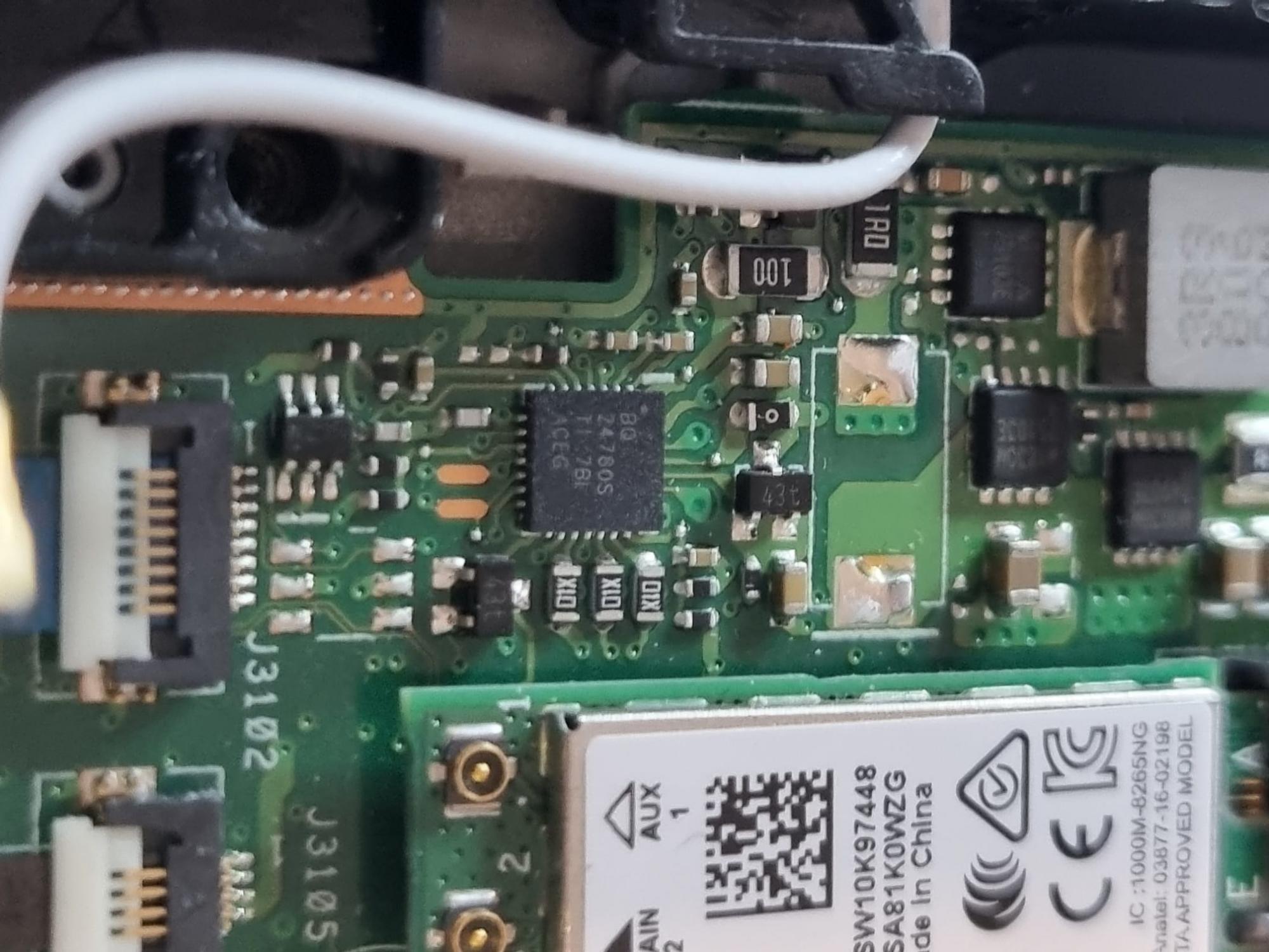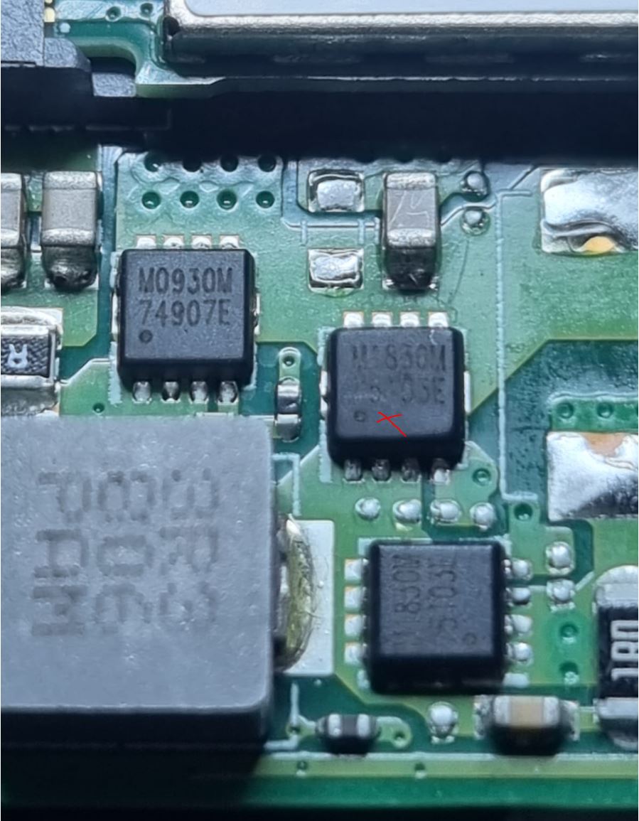 Near these mosfets, locate the charger IC - what are the topside markings? Most likely will be the 'BQ' series from Texas Instruments. Post the full markings and if possible a clear close picture of the area for a review.