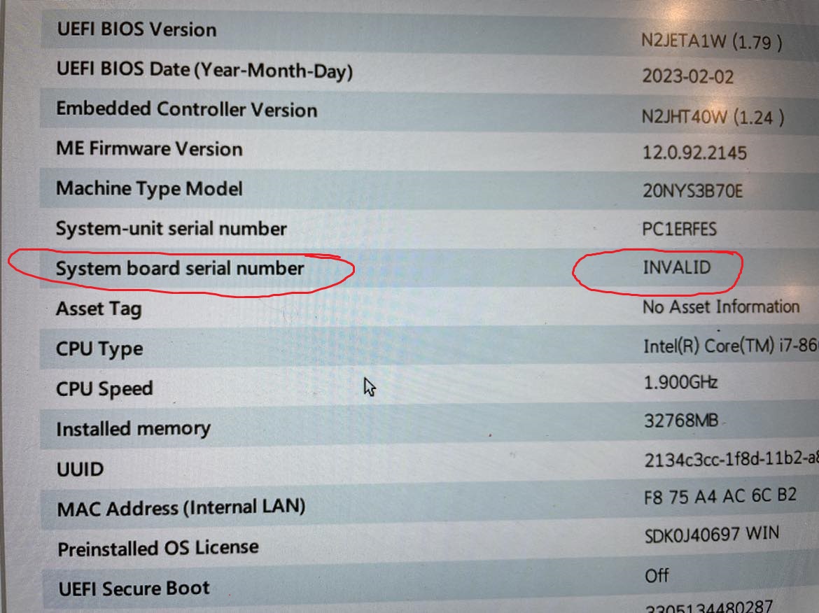 Hi. Lenovo T490s. Need remove bios password. I removed it by erase mec, but now can not repair System board serial number. Can anybody say what lenght it must be? Serial number and modelr repair sucefull, but neet repair it, because show INVALID. Thnaks