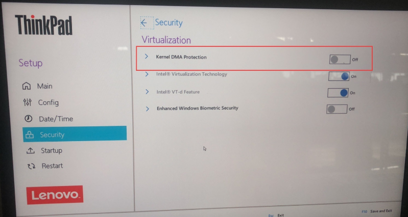 maybe look for Kernel DMA if for change to UEFI/legacy boot settings