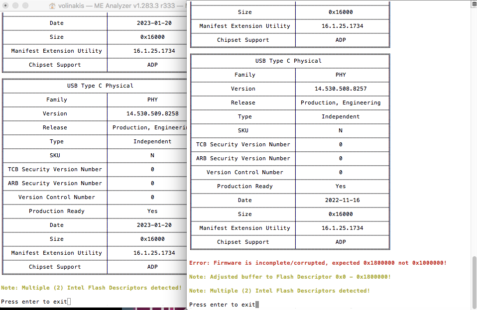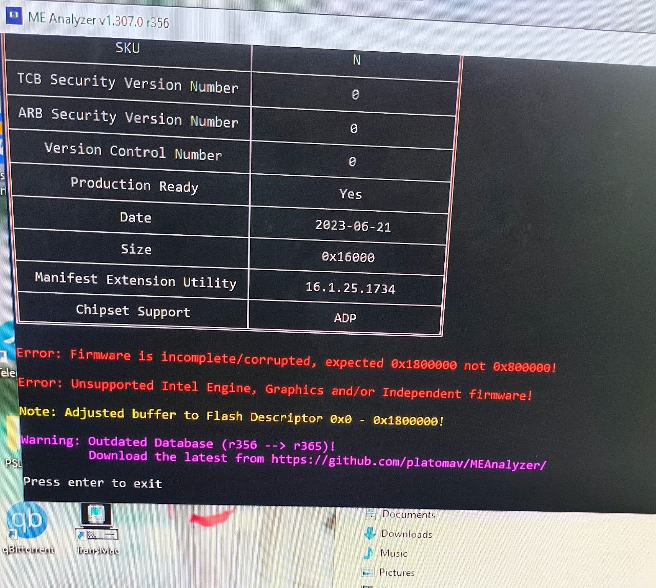 check soldering. Bios is a clean ME image. ME firmware is taken from bios update. Your bios backup had Error: Firmware is incomplete/corrupted, expected 0x1800000 not 0x1000000!