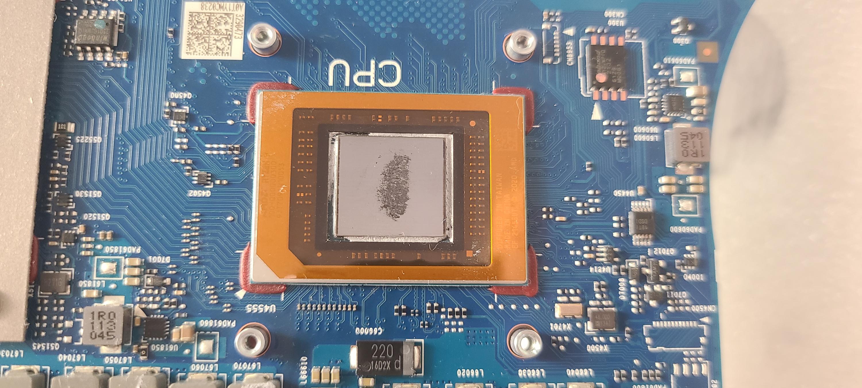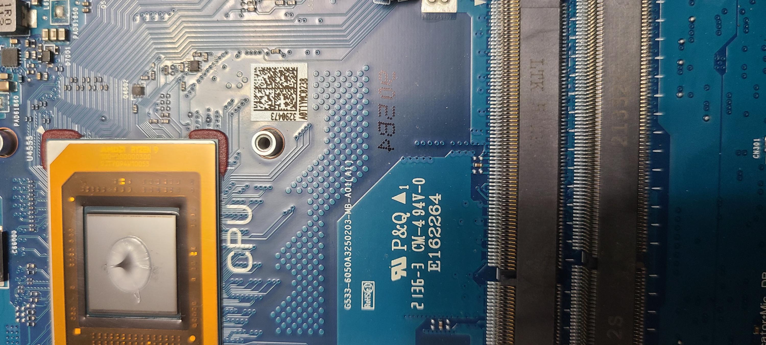 The laptop powers on to no display and the Airplane Mode light on (stable) after blowing the fans. The mobo has been cleaned and both CPU (AMD Ryzen 9) and GPU have been repasted. The CPU had liquid thermal paste, which I'm not sure if it leaked to the mobo and caused any short circuits, but I noticed black lines on the CPU and heatsink when I took it off, like burns. Not sure if that has anything to do with the PC not POSTing. The user said Windows update was stuck before this happened and he is not sure if BIOS was updating (and got interrupted). So I thought I might as well flash the BIOS. No display on an external monitor either. Everything on the mobo was disconnected but no beeping or display.