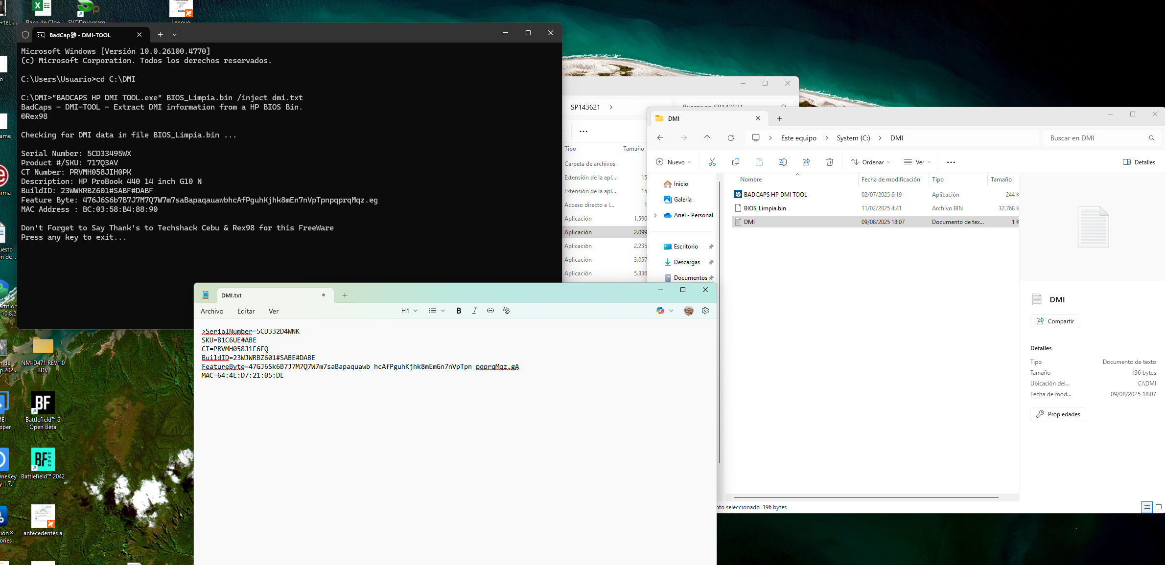 Open 1.txt and fill empty fields with extracted DMI, save file as 2.txt (in Docs, then move it in BCU folder) then use cmd line " biosconfigutility /set:2.txt----------------------------------------------------------------------------------------------------------------------------------------------------------------------