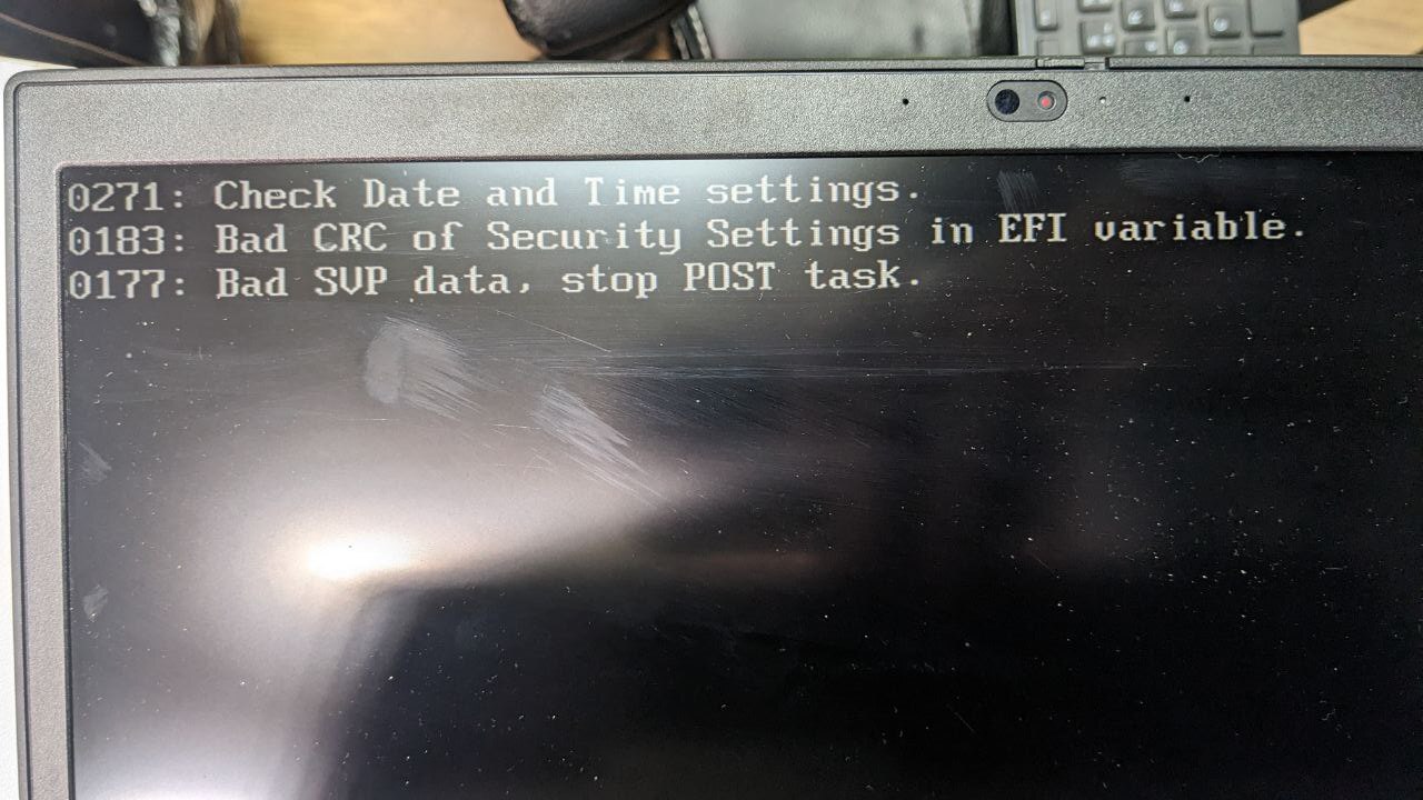 now on every boot up I'm getting error​ 0183: Bad CRC of Security Settings in EFI variable. Press F1 to enter Setup. Then if I press F1 it asks me for a supervisor password. I can't get pass this and boot or go into bios anymore. e.