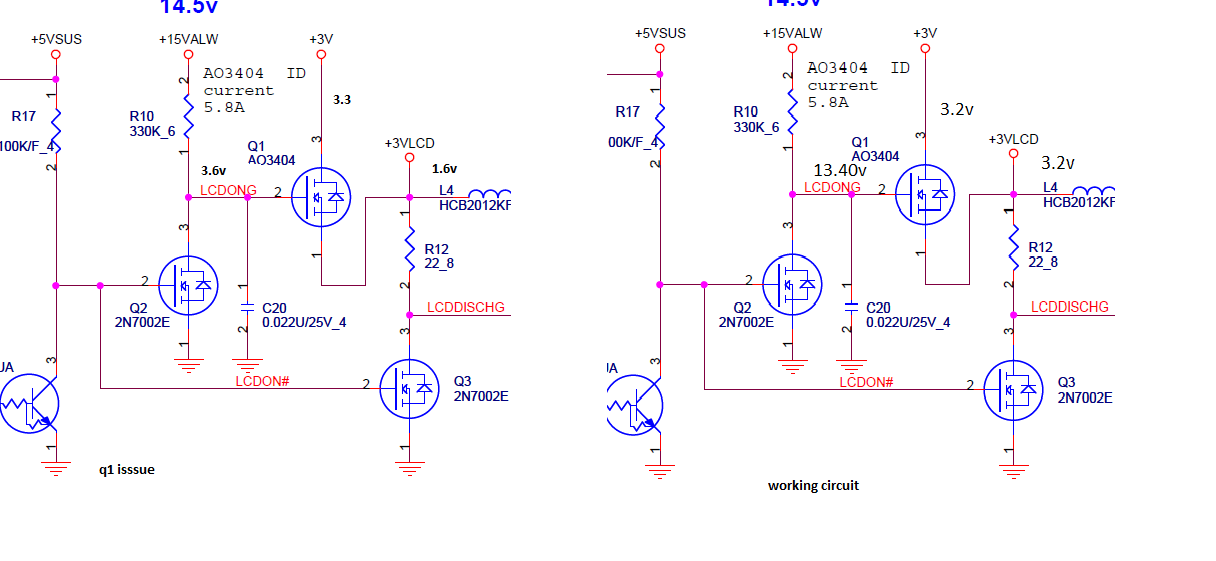 then try replace ao3404 (if test not shorted, q2,q3,q4 can't test cause covered flex) voila it's worked, I've got image on the screen.