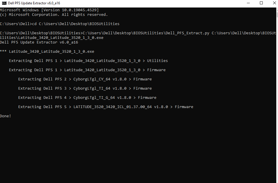 5. Open cmd as admin and go to folder "BiosUtilities" from Desktop. For win10 win11 drag&drop "Dell_PFS_Extract.py" [space] "Latitude_3420_Latitude_3520_1_37_0.exe" and hit Enter. (for win7 use copy/paste)