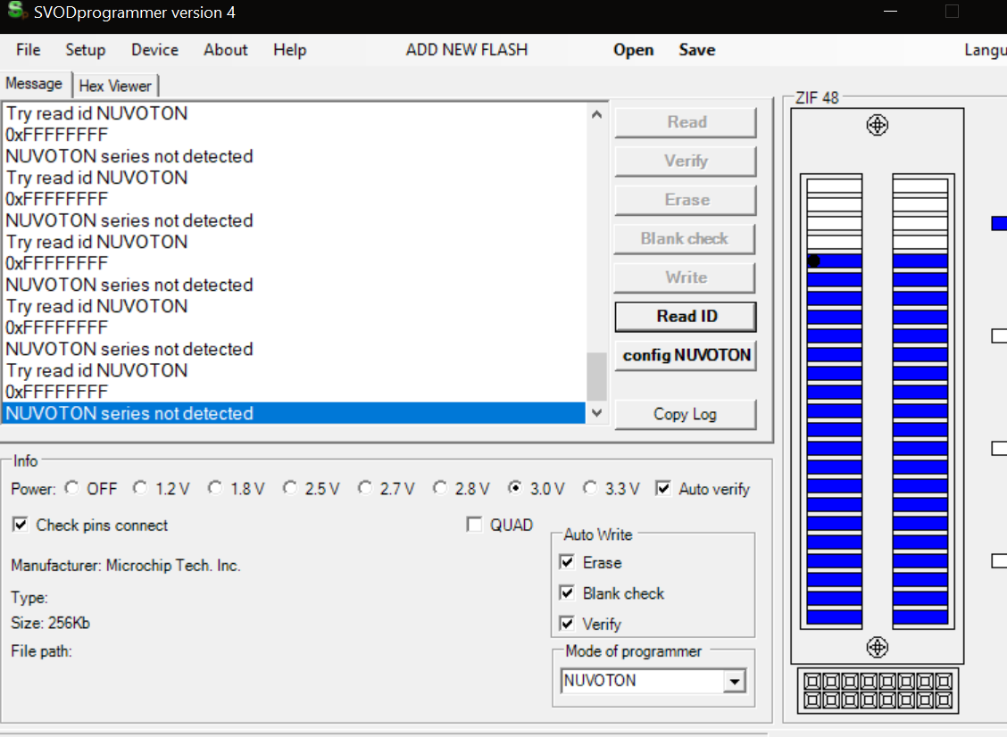I connected my svod4 with a 32pin cable to the keyboard connector. Ground is also connected and power for the mainboard. I can read the Nuvoton ID, but the dump is always empty. Does anyone have an idea?-