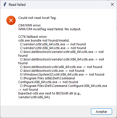 If i download only the DellBiosTools.pyw and run it I get a different error, "Could not read asset tag" I don't have CCTK installed as I use an HP laptop, maybe that feature should be skipped when running on non Dell/Alienware PCs (Asset tag manager)