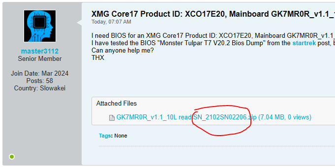 I need BIOS for an XMG Core17 Product ID: XCO17E20, Mainboard GK7MR0R_v1.1_10L. When the power button is pressed, it flashes briefly and the device tries to start briefly, but goes off immediately. Battery is charging.