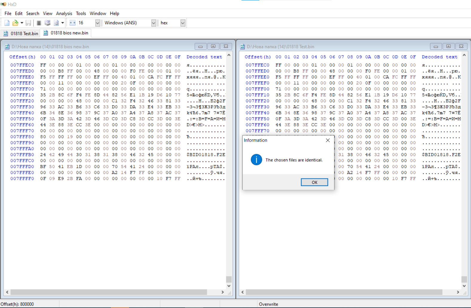 The first picture posted with BID01818 is just showing your bios ID. Use the offsets in the second picture. In HxD close that "Editor Speciali" screen by clicking on the x ,it will only confuse you ,and closing it will give more screen space