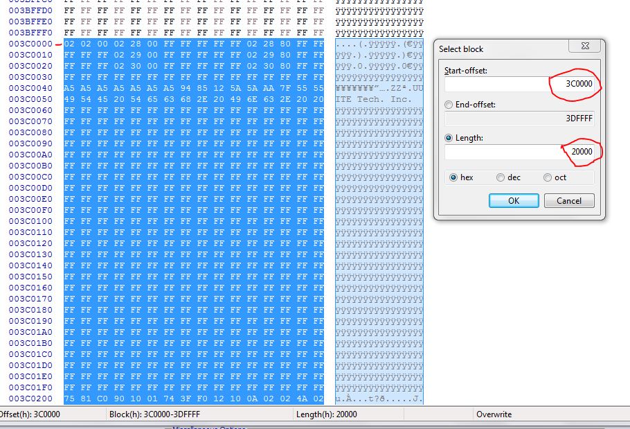 Open the bios with a hex editor,search for the word ITE ,select the offsets in the picture,copy the EC to a new file and save.