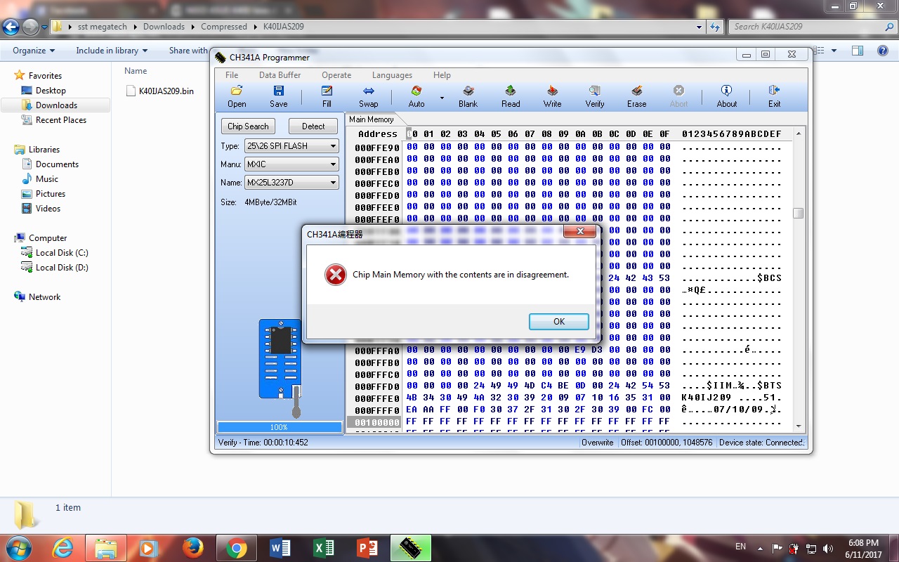 you select chip name 25l3237d your bios 1mb you select chip 25l80.... uper upload bios 1mb.