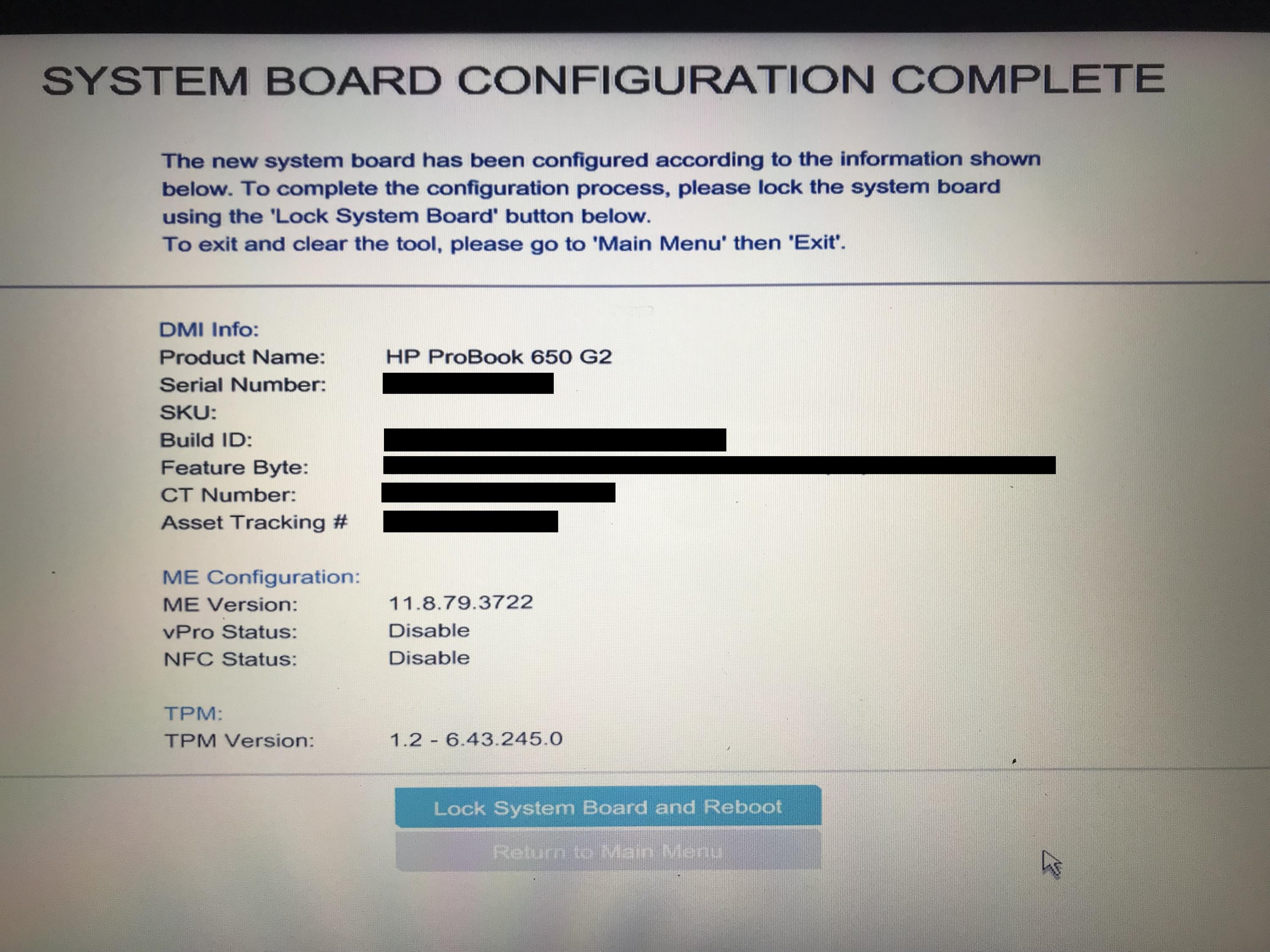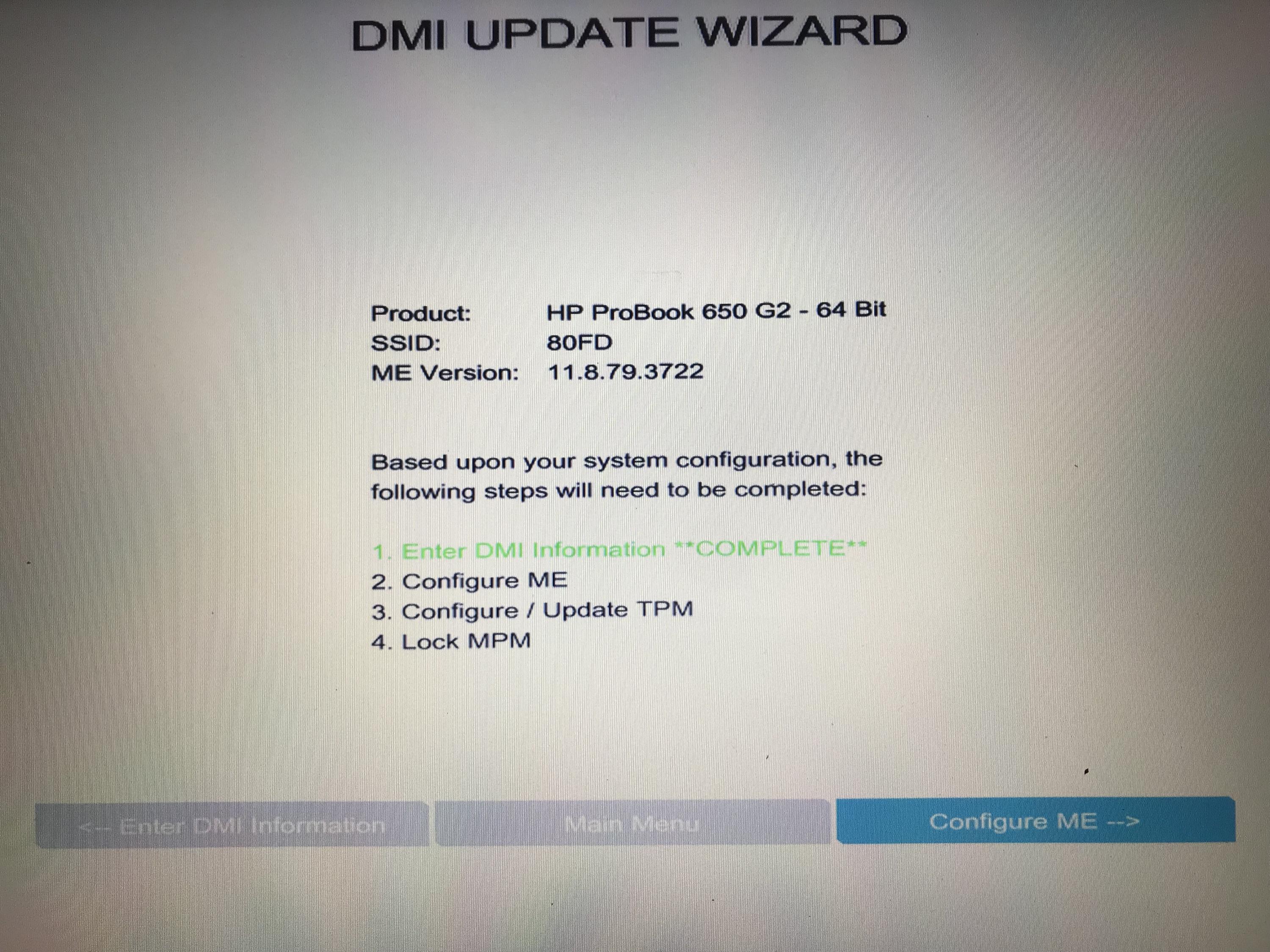 I forgot to add the attachments. Screenshots are for Probook 650 G2. The process for Probook 650 G1 was the same, although for some reason the DMI tools were started within Windows 10, while for Probook 650 G2 were started at startup level (before loading the OS), as you can see in the screenshots.