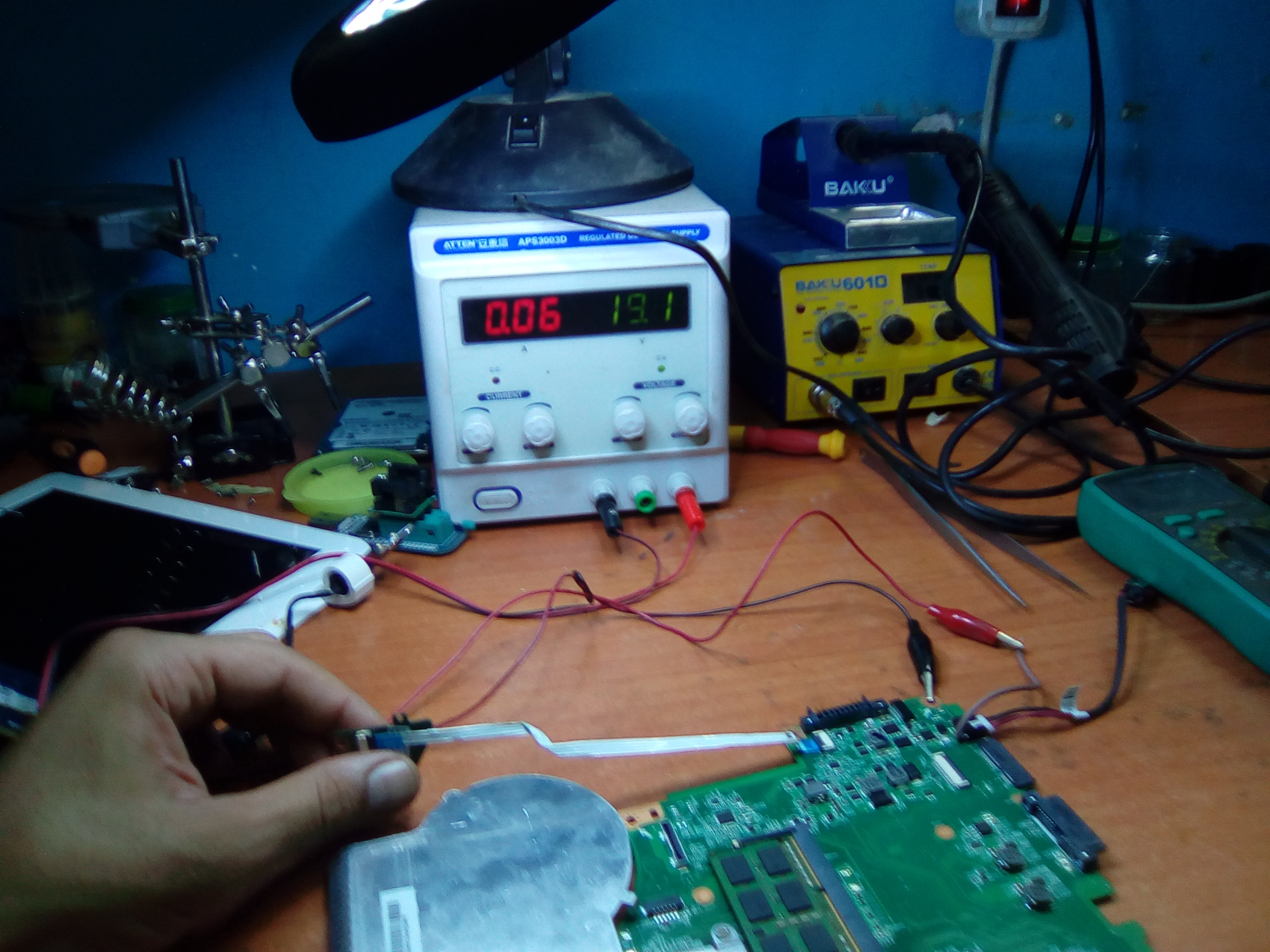 When the laptop arrived (without a charger and SSD), I connected a charger and confirmed with a multimeter that it was charging the battery. However, when I tried to power it on, only the backlight of the secondary display came on. There was no image, and it didn’t boot into the BIOS.