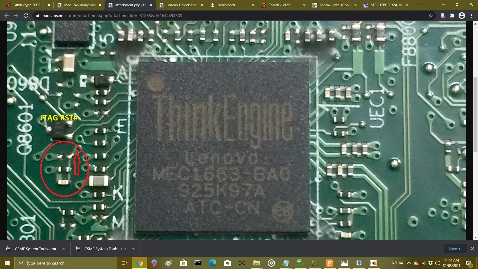 serial numbers were nowhere to be found in the dump, but they were in the bios instead. I blanked the MEC and waited in the hope that the Bios will rewrite it but nothing happened. So I wrote a clean dump into the chip and booted the Thinkpad (holding my breath..) and was greeted with a Supervisor password prompt..(WTF??!!) SO I said to myself perhaps the pass is in the Bios , since it's the first time I've seen serial numbers in the Bios.. I wrote back Clean firmware from Lenovo website and still.. password prompt!!.. SO that leaves to believe the password is now stored elsewhere.. perhaps in the TPM chip?(ST33HTPH2E32) since that chip also has flash memory.. For those who want JTAG_RST# location, I've posted it below.. hope we all put our heads together to come up with a solution..