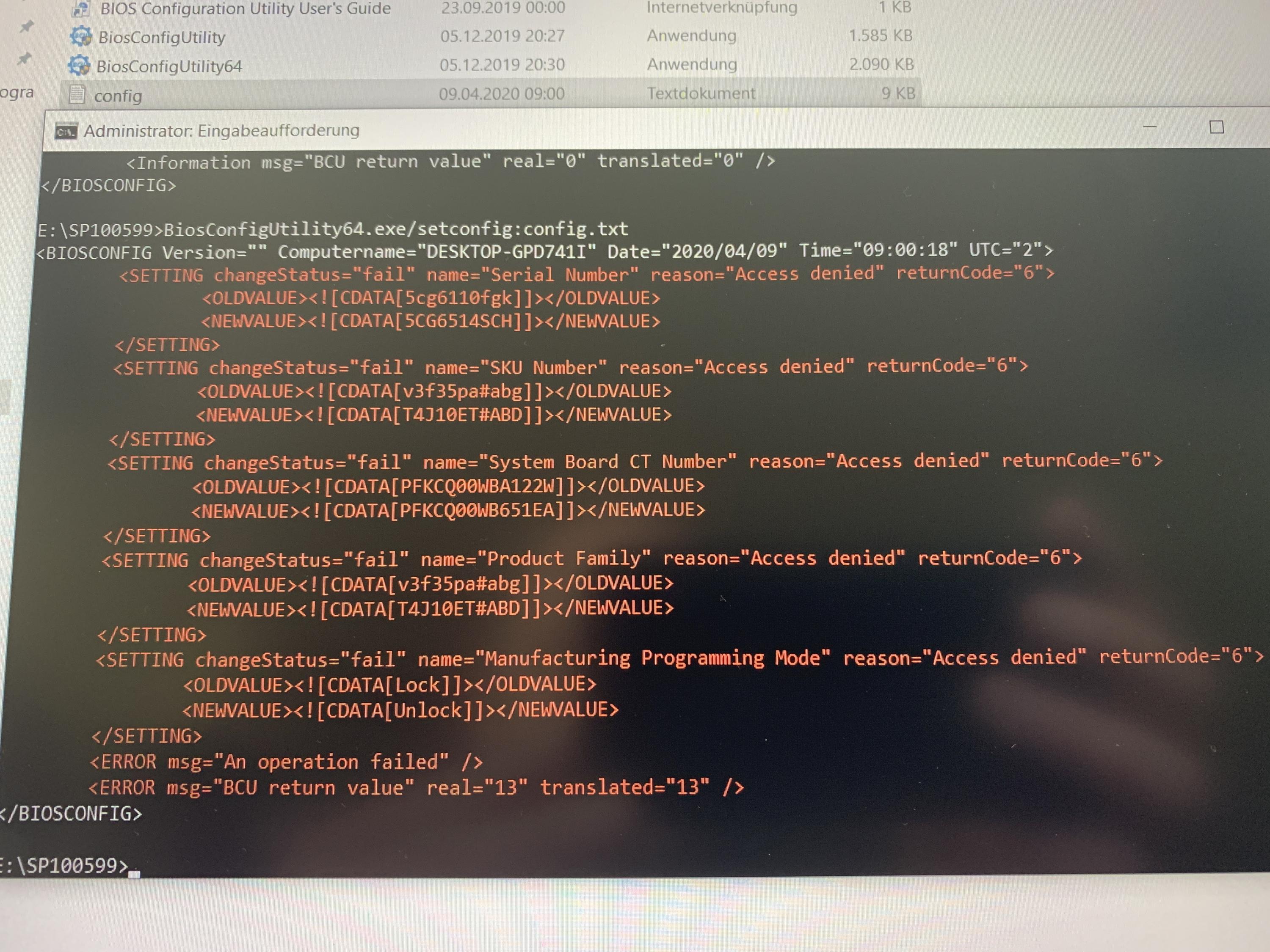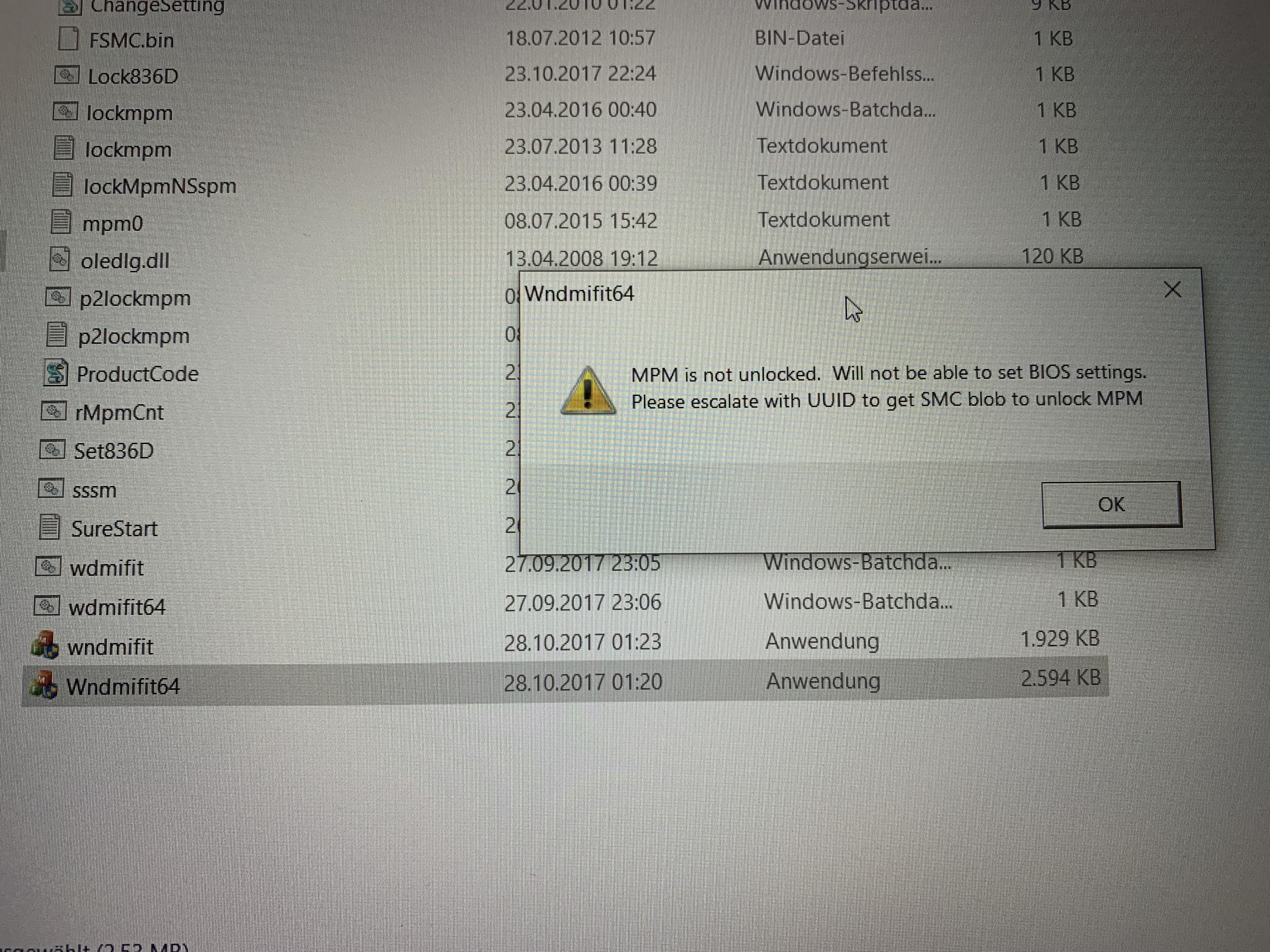 I have already tried the HP BiosConfigTool. That unfortunately did not work. Since the device is probably still in MPM "lock mode". I have already renamed the FSMC.bin to SMC.bin but then I get an error message when booting. I have now attached the pictures of the individual error messages.