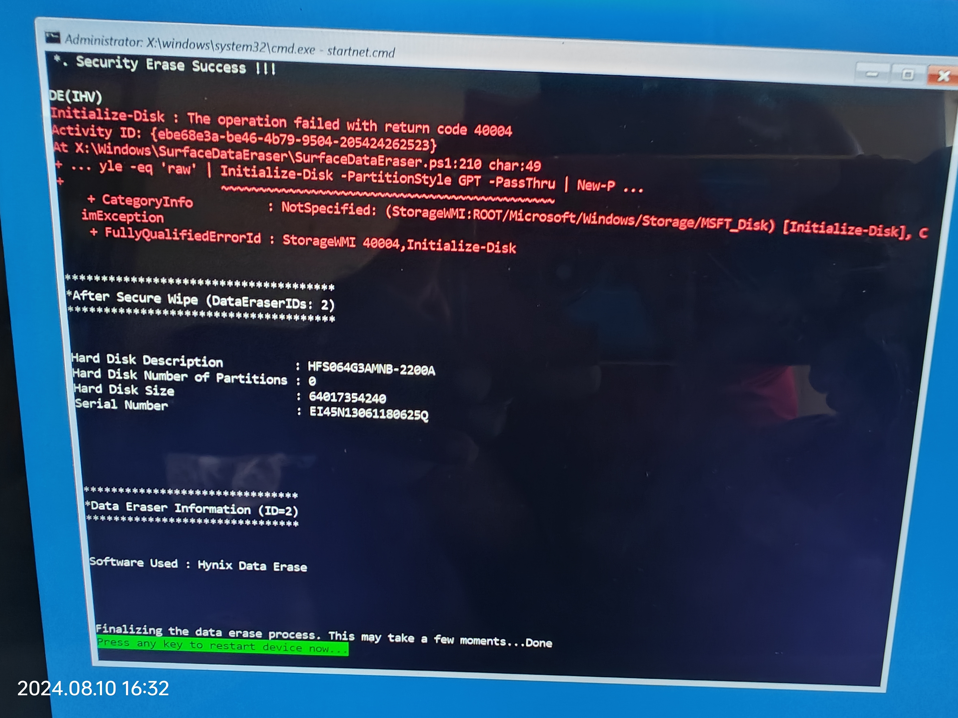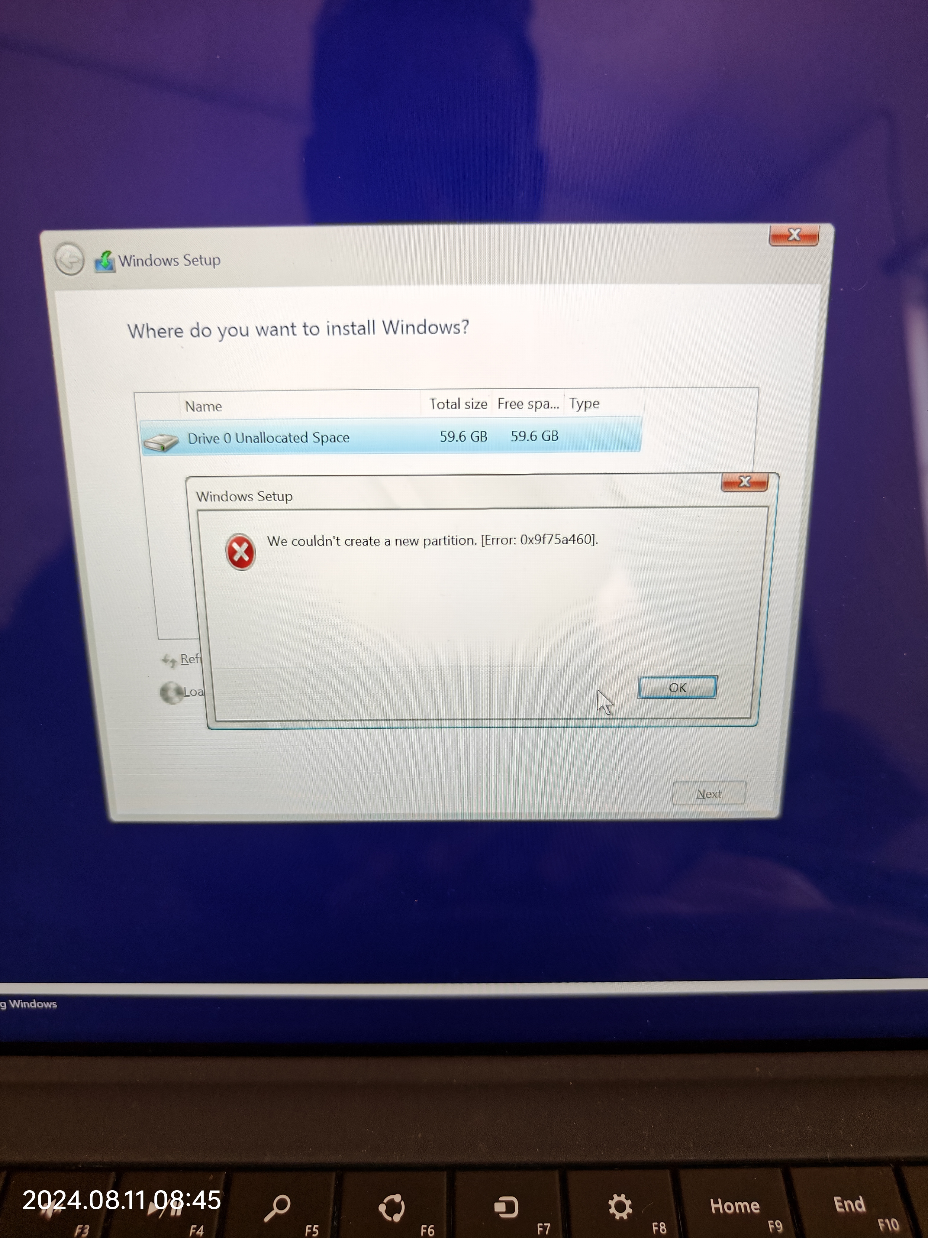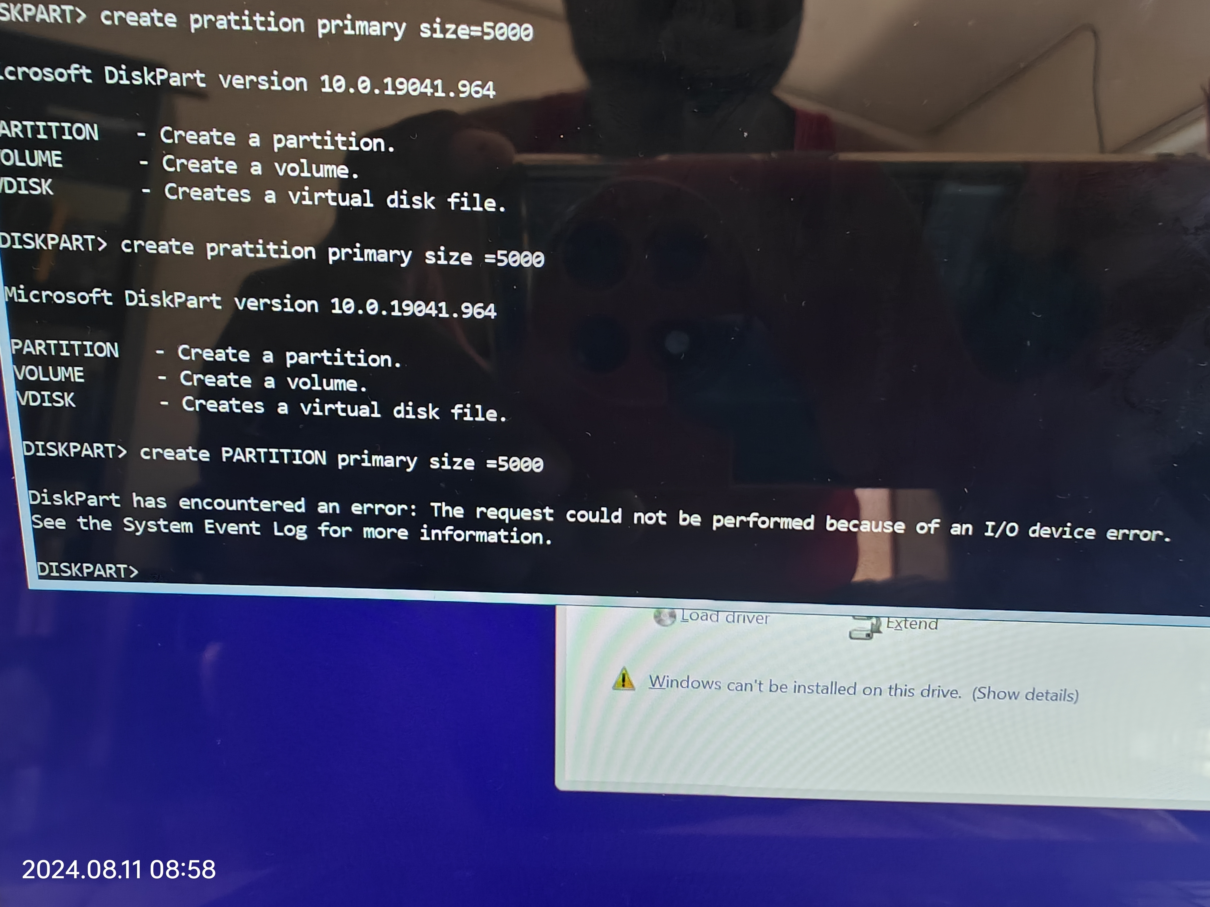 I just tried full and clean instal. I can see it shows internal SSD as 59gb something. But not allowing me to create partition or format it. I tried shift+f10 and entered diskpart to do the partition but it says I/O device error.
