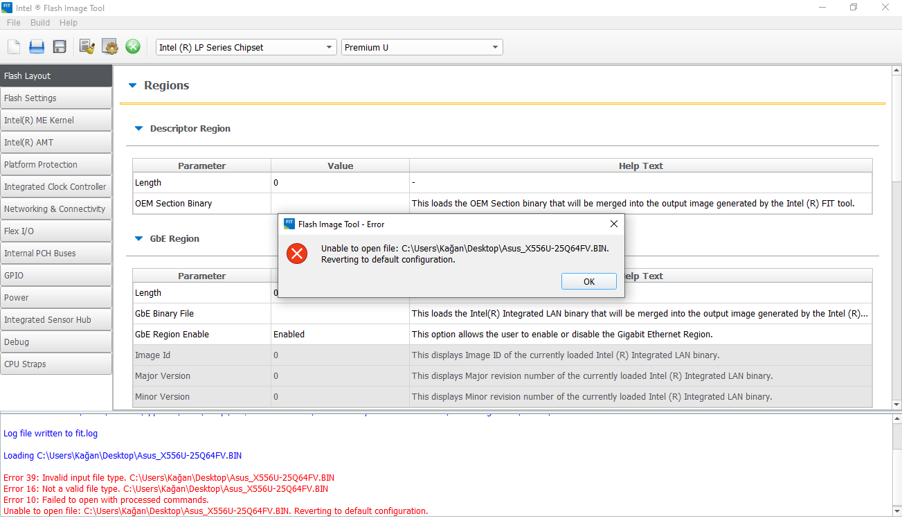 Put your flash image tool in C:\FIT folder. Your windows username has a character FIT might not like. I had similar problem with FIT.Comment